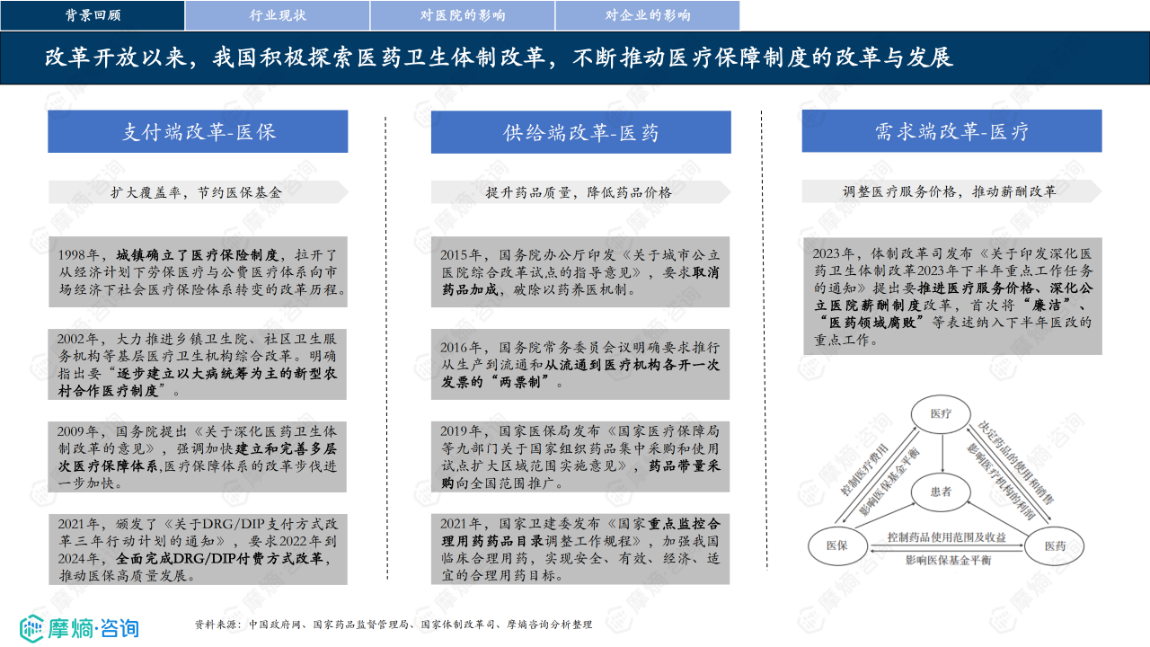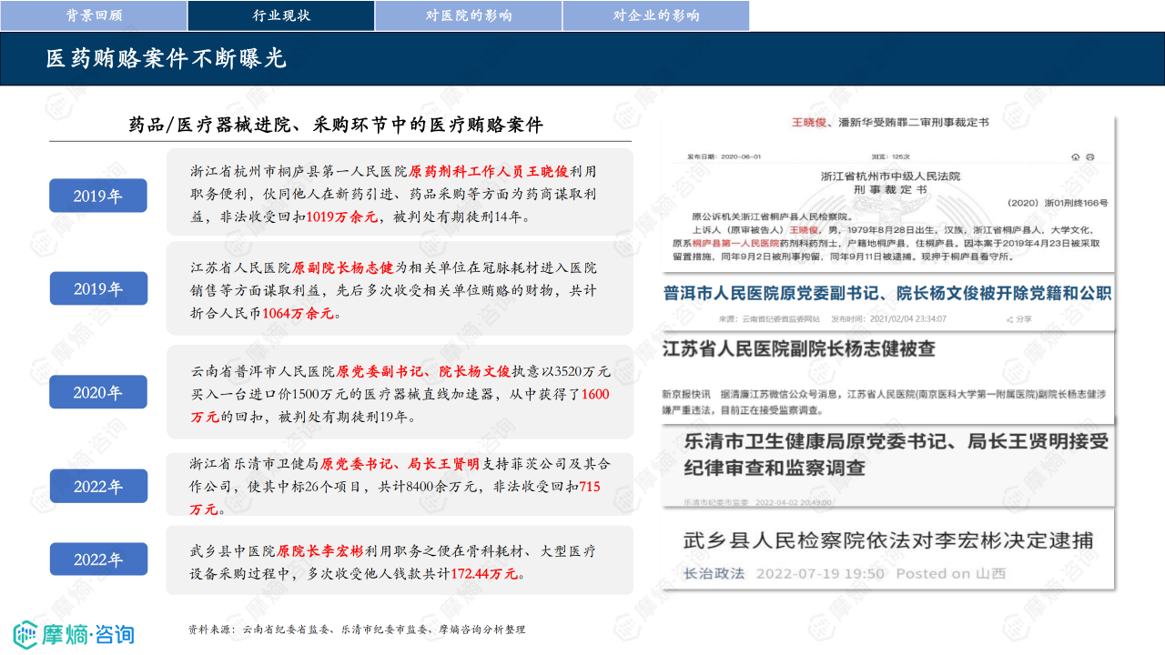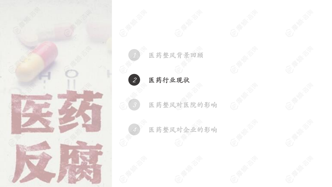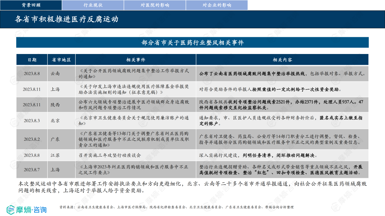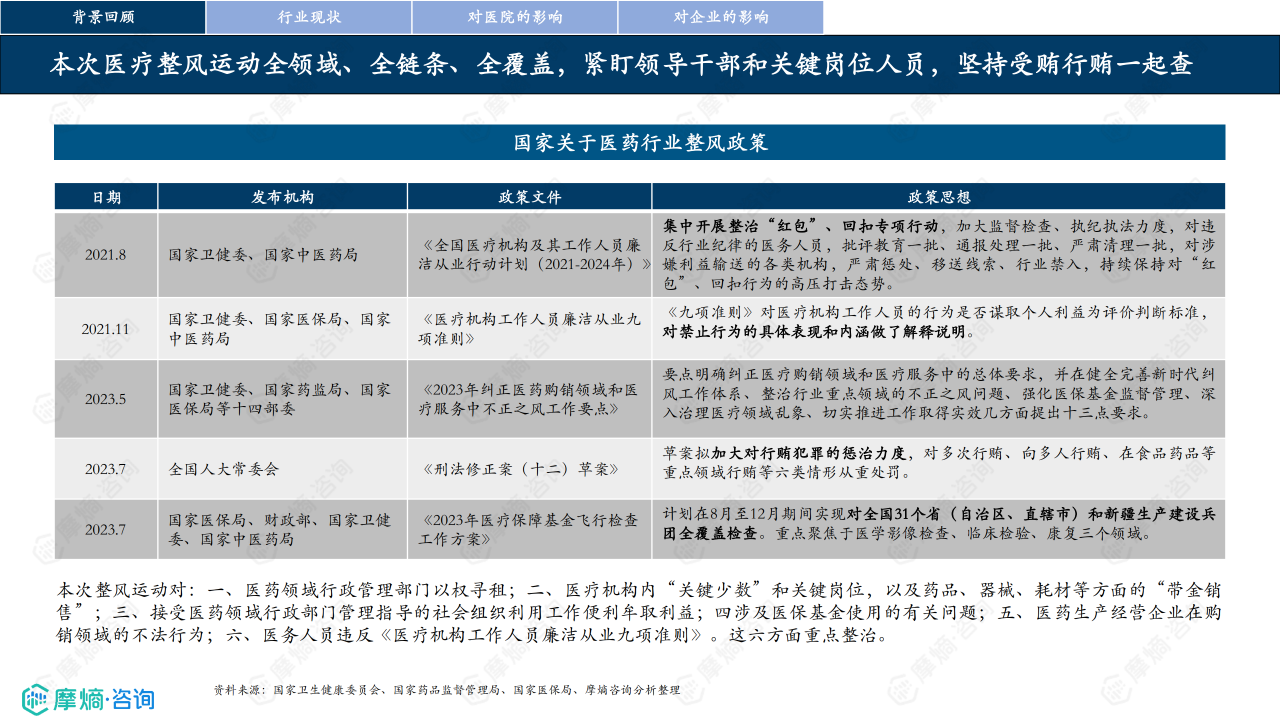 摩熵咨询《反腐整风运动下医疗及药企产业变局分析》报告从医药整风的背景、目的出发,全面分析反腐整风对医疗及药企产业的影响,探讨医院、企业在这一过程中的变化与挑战。我们希望通过本报告,为行业内外提供有价值的参考,共同推动医疗及药企产业在反腐整风的新时代背景下实现健康、可持续发展。