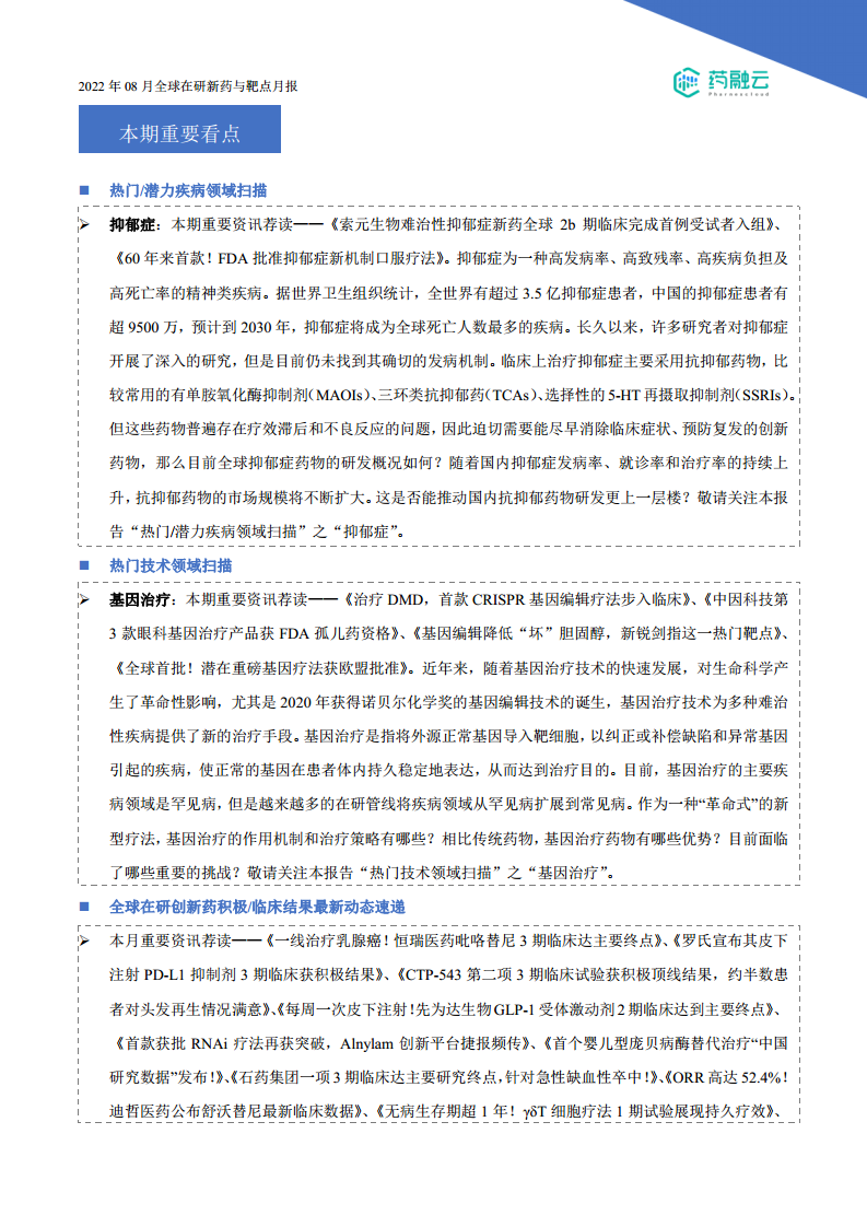 本报告总结了2022年8月全球及中国在研新药与靶点领域的市场动态,核心观点如下: