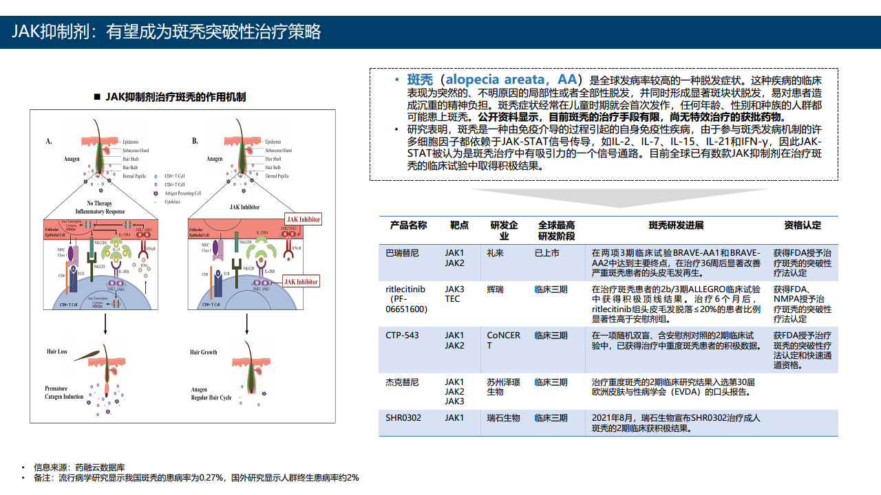 全球已上市9款JAK抑制剂,其中4款为第二代选择性抑制剂。第一代JAK抑制剂虽然疗效显著,但存在感染、血细胞减少等不良反应。第二代JAK抑制剂通过靶向抑制特定JAK蛋白,在安全性方面有所改善。全球在研项目数量庞大,辉瑞、罗氏、Incyte等企业处于领先地位。在研适应症涵盖多种自身免疫性疾病,类风湿性关节炎的研发热度和成熟度最高。斑秃作为一种新兴适应症,也受到越来越多的关注,多款JAK抑制剂已在临床试验中取得积极结果,有望成为斑秃的突破性治疗策略。