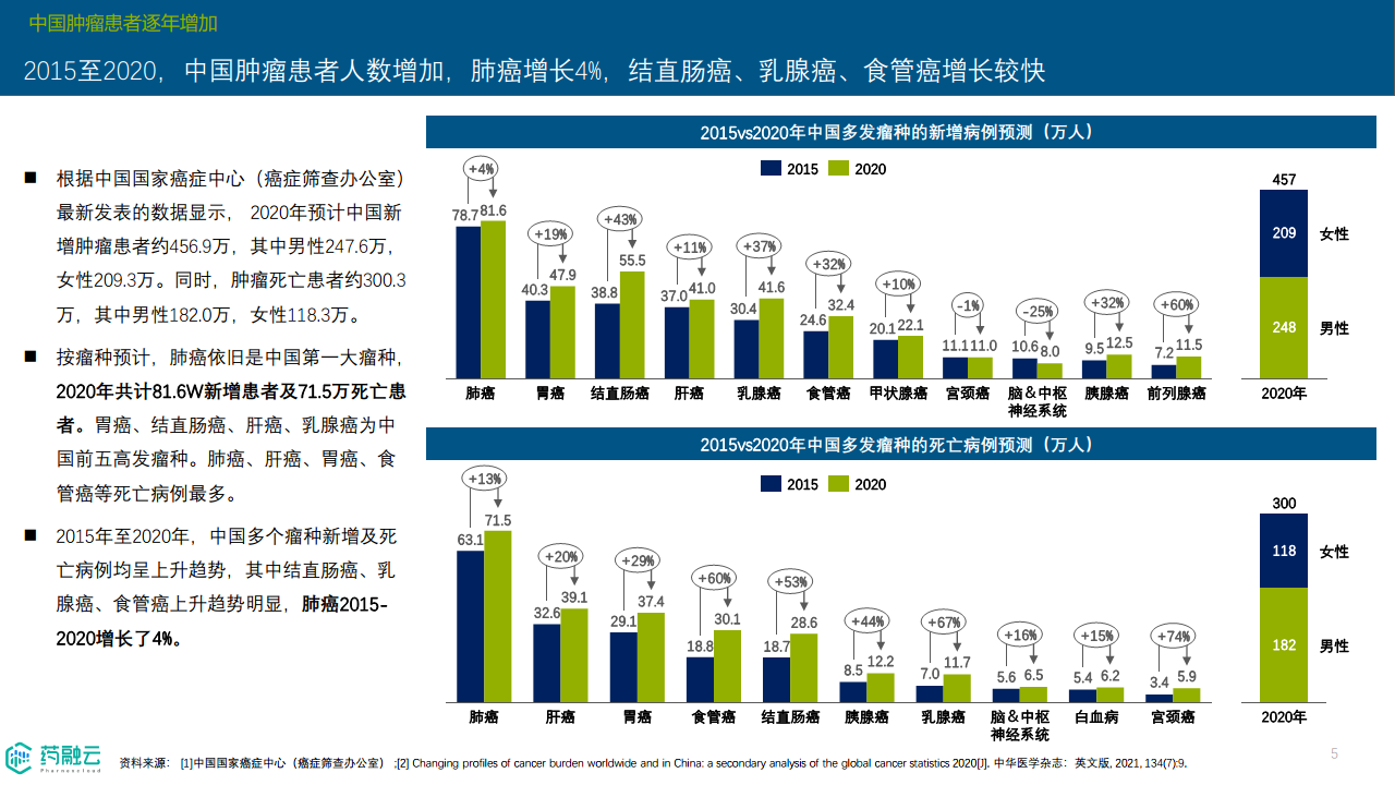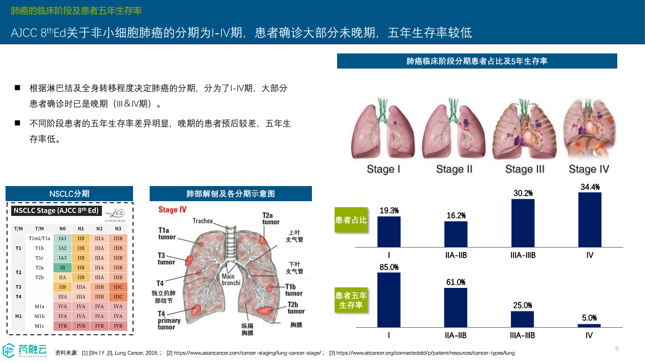 报告首先分析了中国肺癌的流行病学现状,指出肺癌是中国发病率和死亡率最高的恶性肿瘤,且近年来发病人数持续增加。数据显示,2020年中国肺癌新增病例约81.6万,死亡病例约71.5万,男性发病率高于女性。 报告还提及中国肺癌患者5年生存率近年来显著提高,但与发达国家相比仍存在差距,这反映了中国癌症护理质量的进步空间。 报告进一步分析了中国肺癌的病例组织学及基因突变分型,指出非小细胞肺癌(NSCLC)占绝大多数,其中腺癌比例最高,EGFR突变是亚洲人群中最常见的驱动基因突变。 最后,报告简述了肺癌的临床分期及患者五年生存率,指出大部分患者确诊时已处于晚期,预后较差。