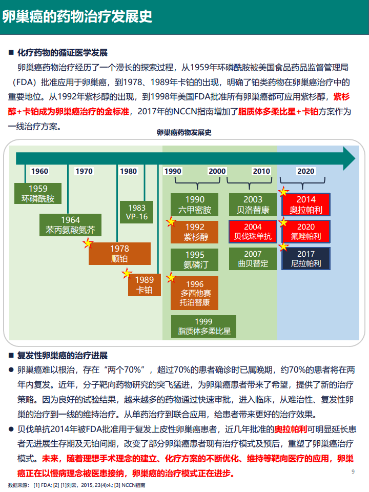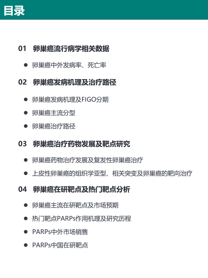 本报告基于公开数据和文献,对卵巢癌药物市场及靶点进行分析,核心观点如下: