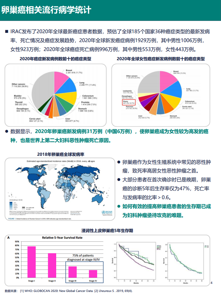 全球卵巢癌发病率和死亡率较高,2020年全球新发病例约31万例(中国6万例),是女性高发癌症,也是第二大妇科恶性肿瘤死亡原因。卵巢癌早期症状不明显,诊断困难,大部分患者确诊时已为晚期,5年生存率仅为47%,死亡率与发病率比率超过0.6。这些数据凸显了卵巢癌治疗的紧迫性和挑战性。