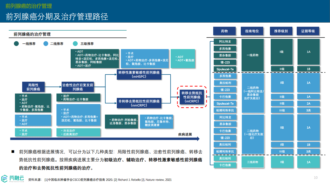 目前前列腺癌的治疗方法包括手术、放疗、化疗、内分泌疗法以及靶向治疗等。内分泌疗法主要包括GnRH激动剂/拮抗剂、CYP17抑制剂以及非甾体/甾体抗雄激素等。靶向治疗则主要针对AR、PARP等靶点。CSCO前列腺癌诊疗指南2020版对不同分期和类型的患者提供了详细的治疗建议。