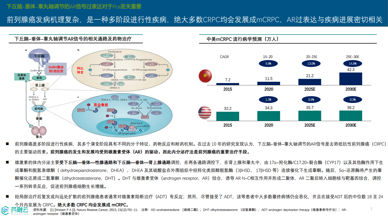 前列腺癌是一种多阶段进行性疾病,雄激素受体(AR)的过表达与疾病进展密切相关。下丘脑-垂体-睾丸轴调节的AR信号通路是CRPC(去势抵抗性前列腺癌)的主要驱动因素。内分泌疗法是前列腺癌的重要治疗手段,但大多数患者最终会发展为CRPC,甚至mCRPC(转移性去势抵抗性前列腺癌),治疗选择有限。