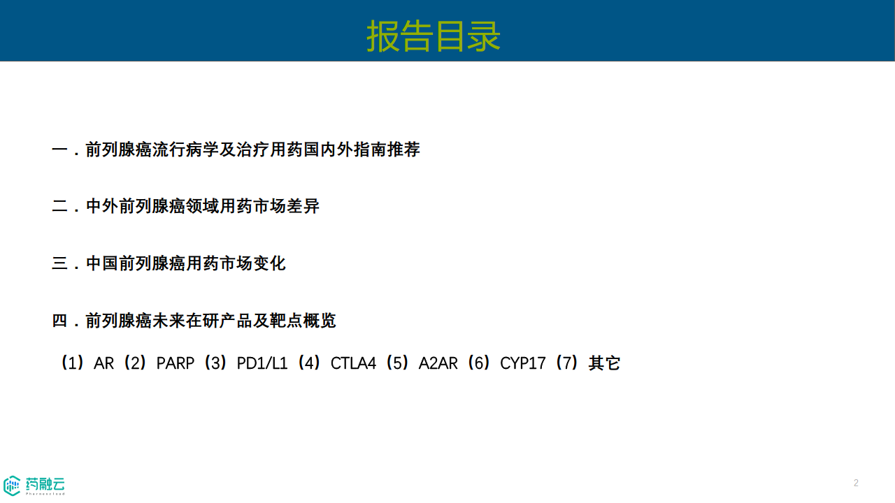 本报告从前列腺癌流行病学、中外用药市场差异、中国市场变化以及未来在研产品和靶点四个方面展开分析。
