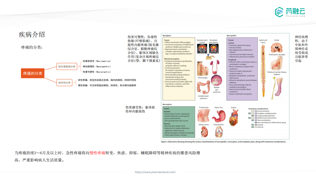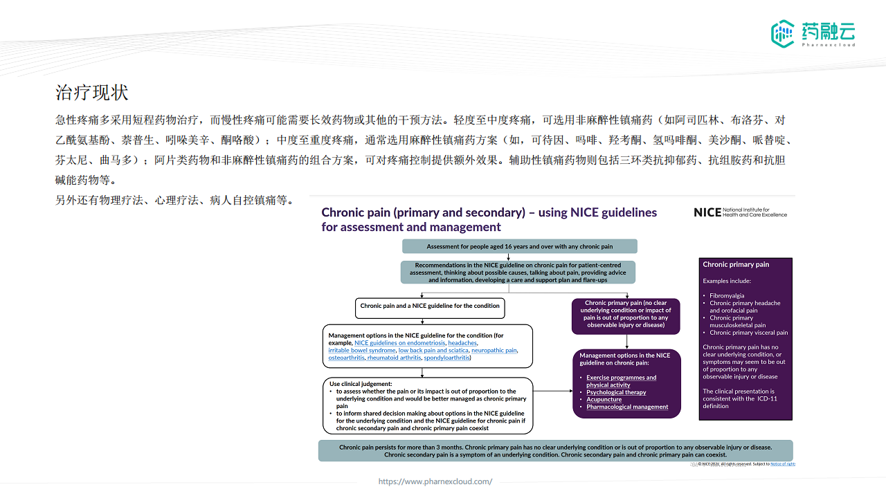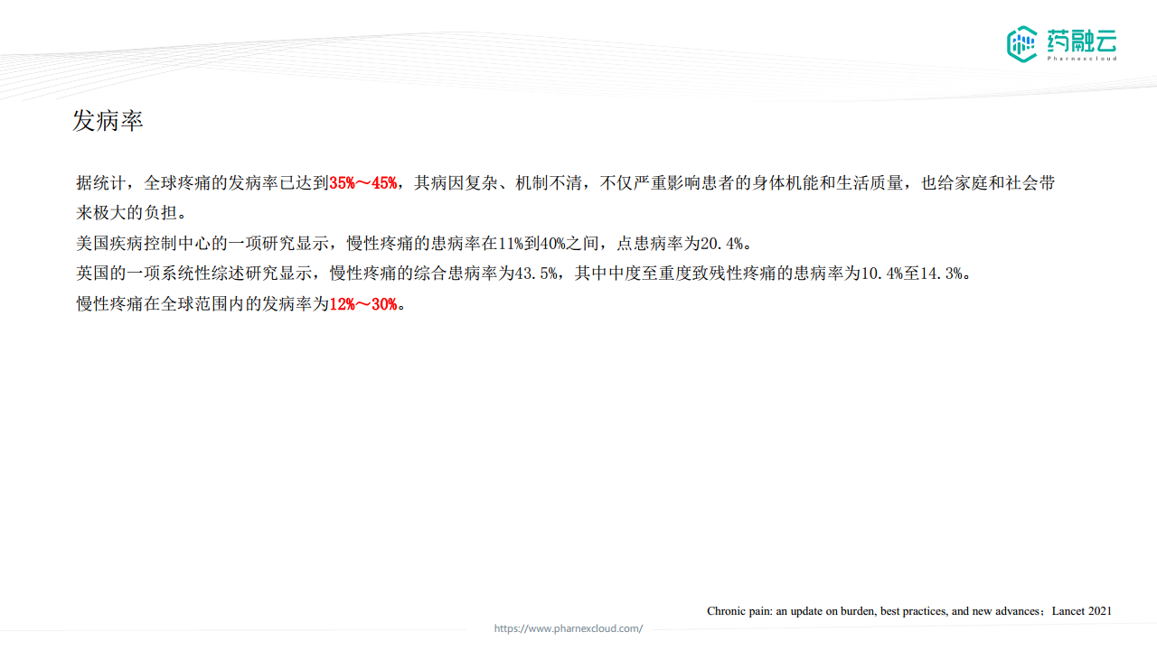 疼痛被定义为“与实际或潜在组织损伤相关的感觉、情绪、认知和社会多维度的痛苦体验”,这一定义强调了疼痛不仅仅是生理现象,还包括心理和社会因素。全球疼痛的发病率已达到35%~45%,中国是全球主要的镇痛类药物使用国家之一,但国内镇痛市场品种相对缺乏,市场销售格局未定,具有很大的增长空间。报告全面分析了疼痛治疗药物的多个关键领域,包括疼痛流行病学和作用机制、治疗现状、全球上市药物及市场情况、在研药物及潜力靶点等,旨在为理解疼痛治疗药物的市场和研发现状提供参考。
