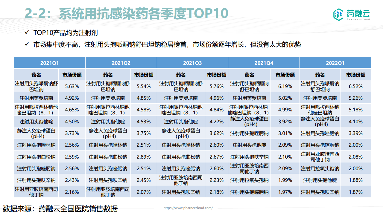 本报告利用摩熵医药提供的全国医院销售数据,对中国抗感染药物市场进行了全面的分析。报告指出,尽管2020年疫情导致市场波动,但2022年Q1市场已出现显著复苏。抗感染药市场集中度不高,注射剂占据主导地位,但缺乏绝对的市场领导者。国家带量采购政策对市场产生了深远影响,既带来价格下降,也为部分企业提供了机会。未来,随着细菌耐药性问题的加剧,创新型抗菌药物、口服抗感染药、抗病毒药和窄谱抗生素将成为市场发展趋势。企业应结合销售数据、政策、上游信息、研发、资本及趋势等多方面因素,寻找具有竞争力的产品,挖掘普药的机会点。 需要注意的是,报告数据仅基于摩熵医药提供的资料,其全面性和代表性有待进一步考量。