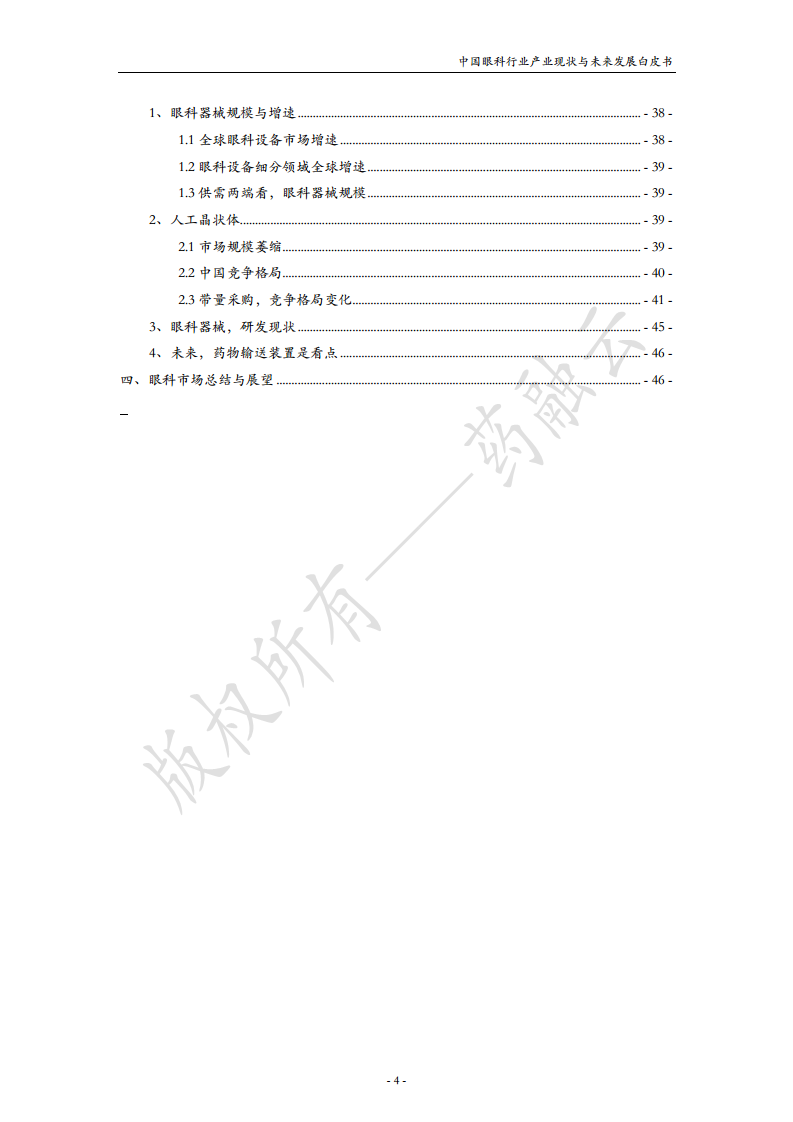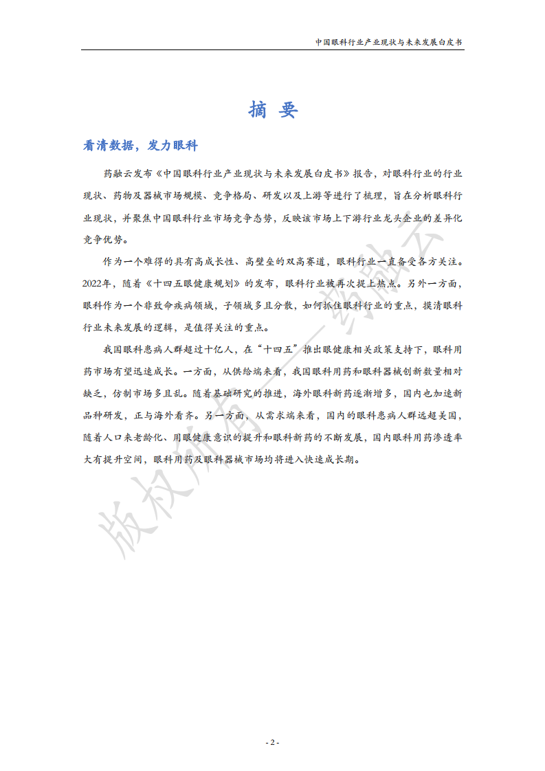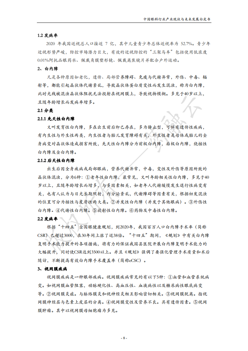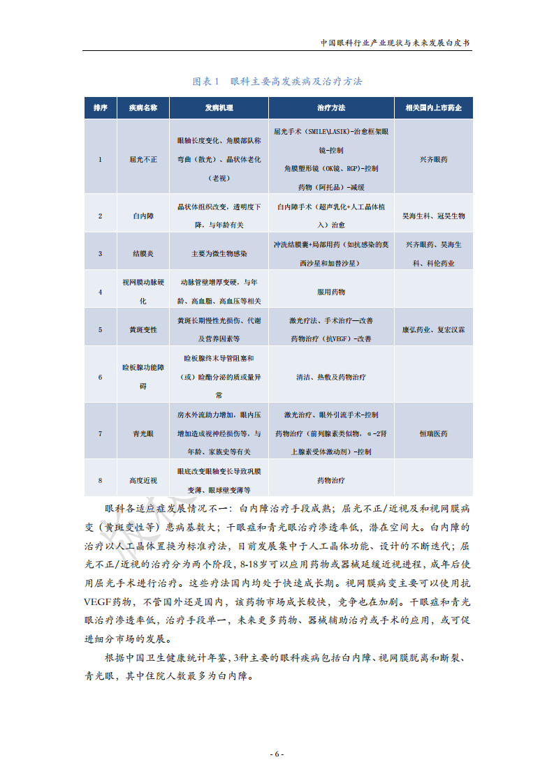 本报告主要从眼科疾病、眼科药物、眼科器械三个方面展开分析,并对未来发展趋势进行展望。