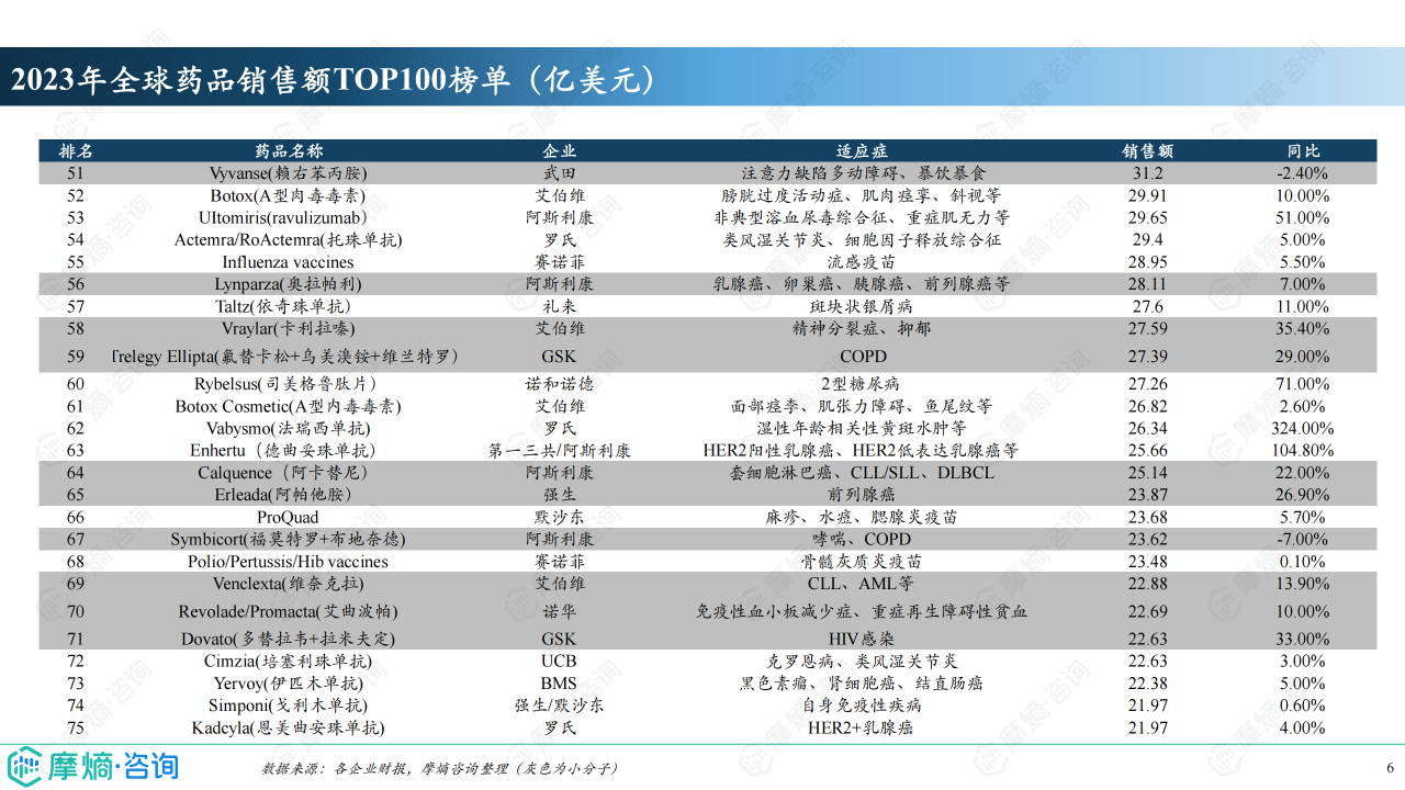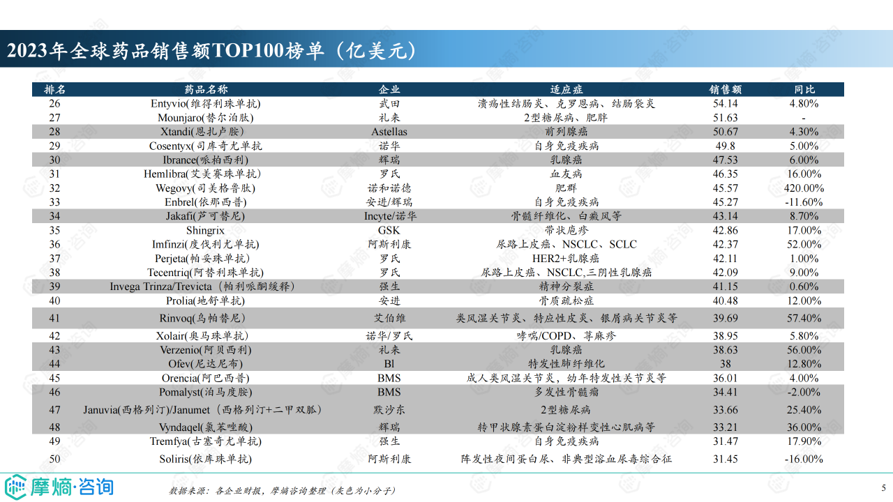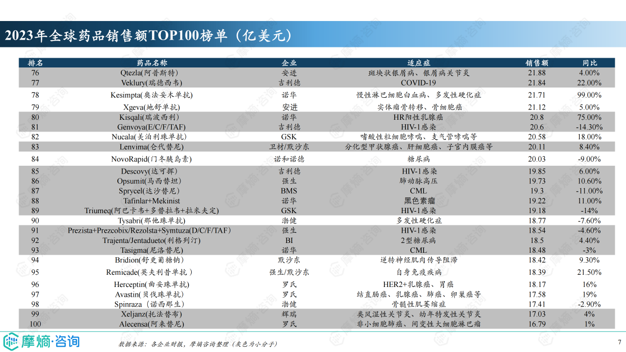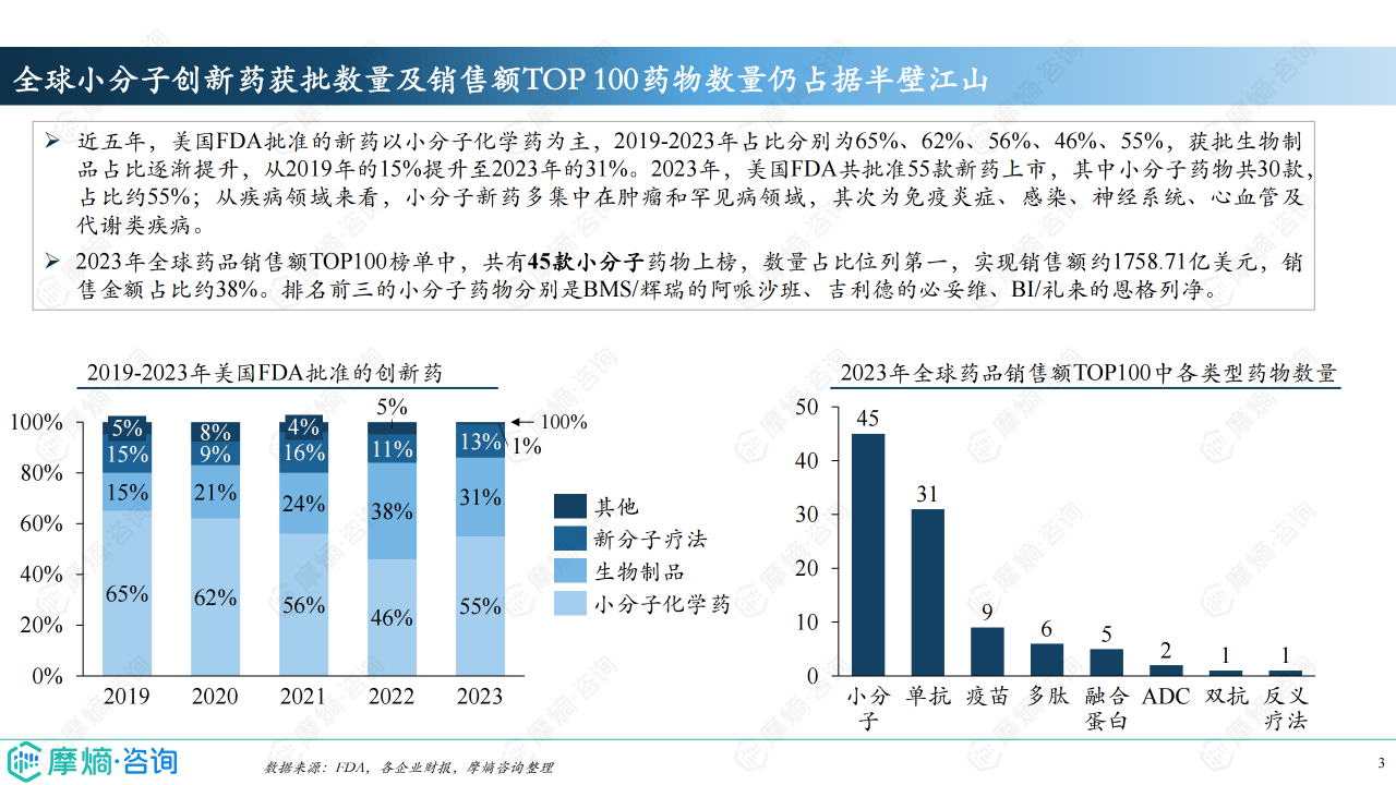 2023年全球药品销售额TOP100榜单中,小分子药物数量占比第一,达到45款,销售额约1758.71亿美元,占比约38%。这表明小分子药物在全球医药市场中仍占据主导地位,但生物制剂的占比也在不断提升,未来市场竞争将更加激烈。