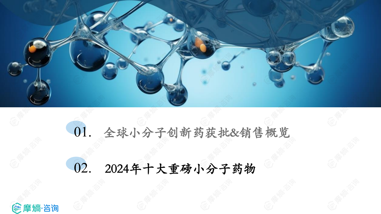 本报告基于摩熵咨询提供的2024年十大重磅小分子药物数据,从获批数量、销售额、研发进度、创新性和市场前景等维度,对全球小分子创新药市场进行分析,并重点剖析十大重磅小分子药物的研发背景、作用机制、临床数据、市场竞争格局及未来销售预测。核心观点如下: