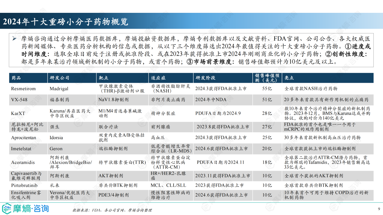 报告的核心部分是分析2024年十大重磅小分子药物。这些药物均处于注册或批准阶段,或在2023年获得批准上市,并预计2024年实现商业化,其销售峰值均预计在10亿美元以上。 这些药物涵盖了NASH、疼痛、精神分裂症、前列腺癌、高血压、骨髓增生异常综合征、心肌病以及慢性阻塞性肺病等多个治疗领域,体现了小分子药物在不同疾病领域的广泛应用。