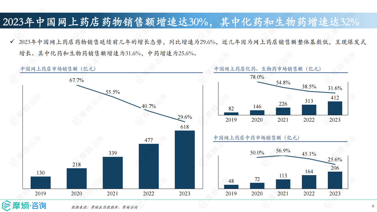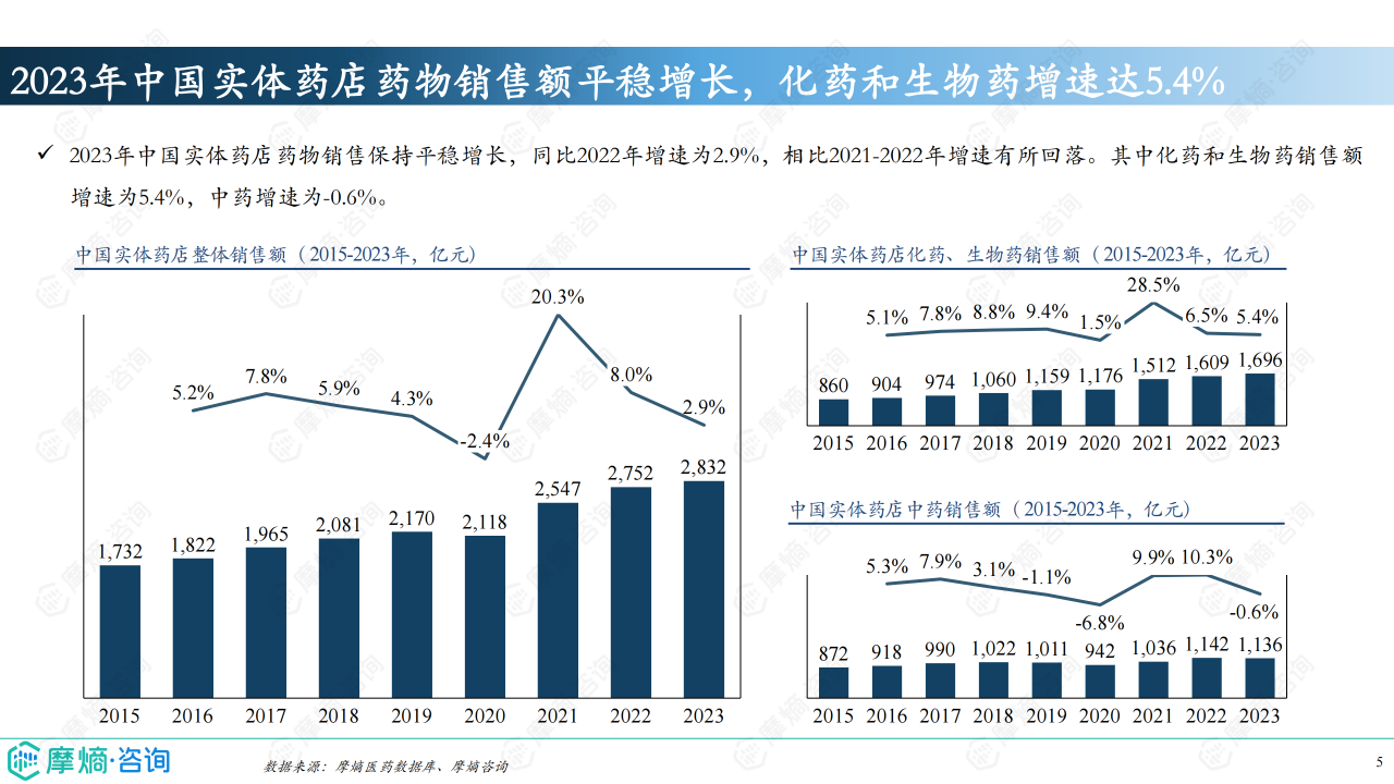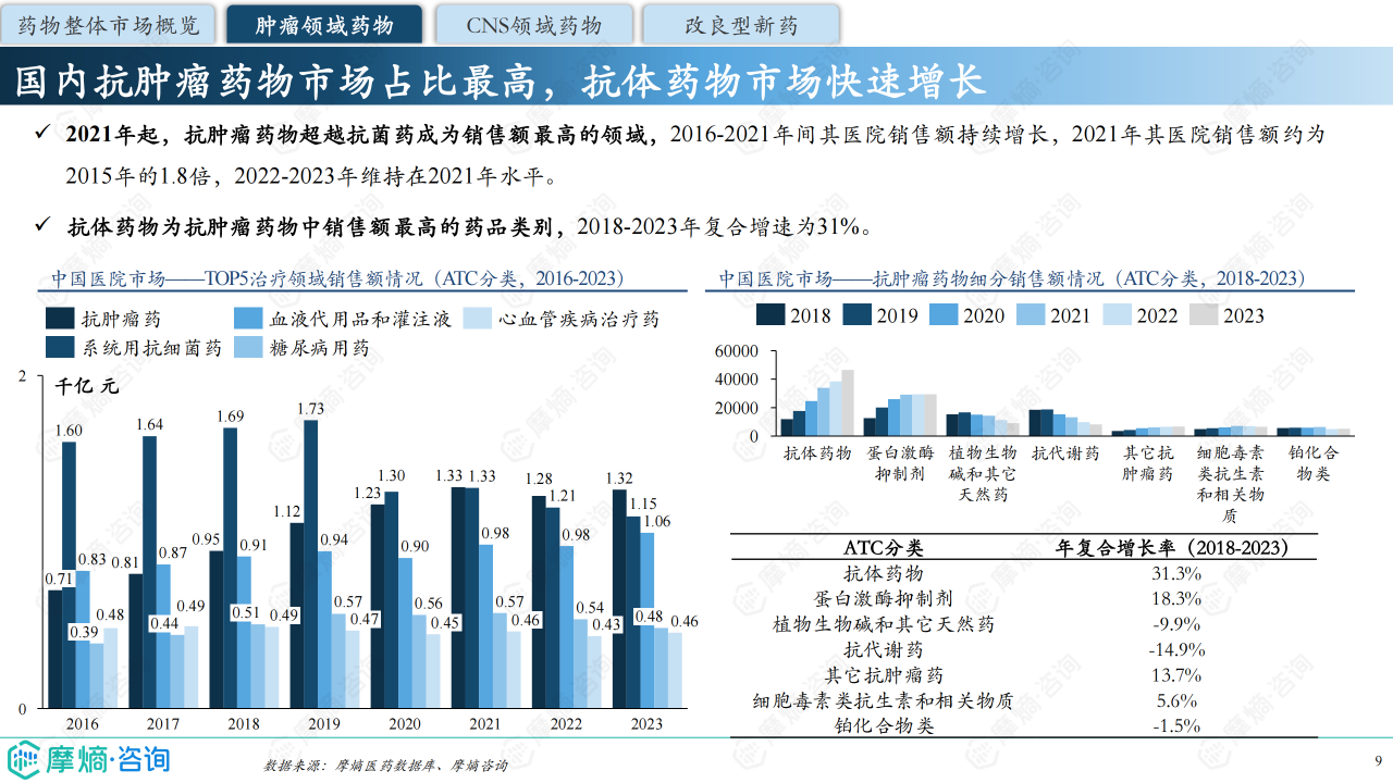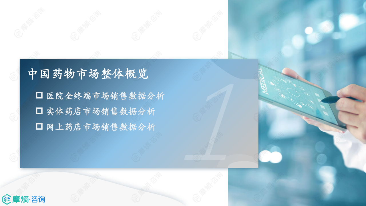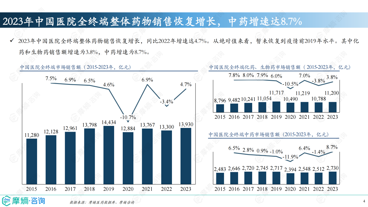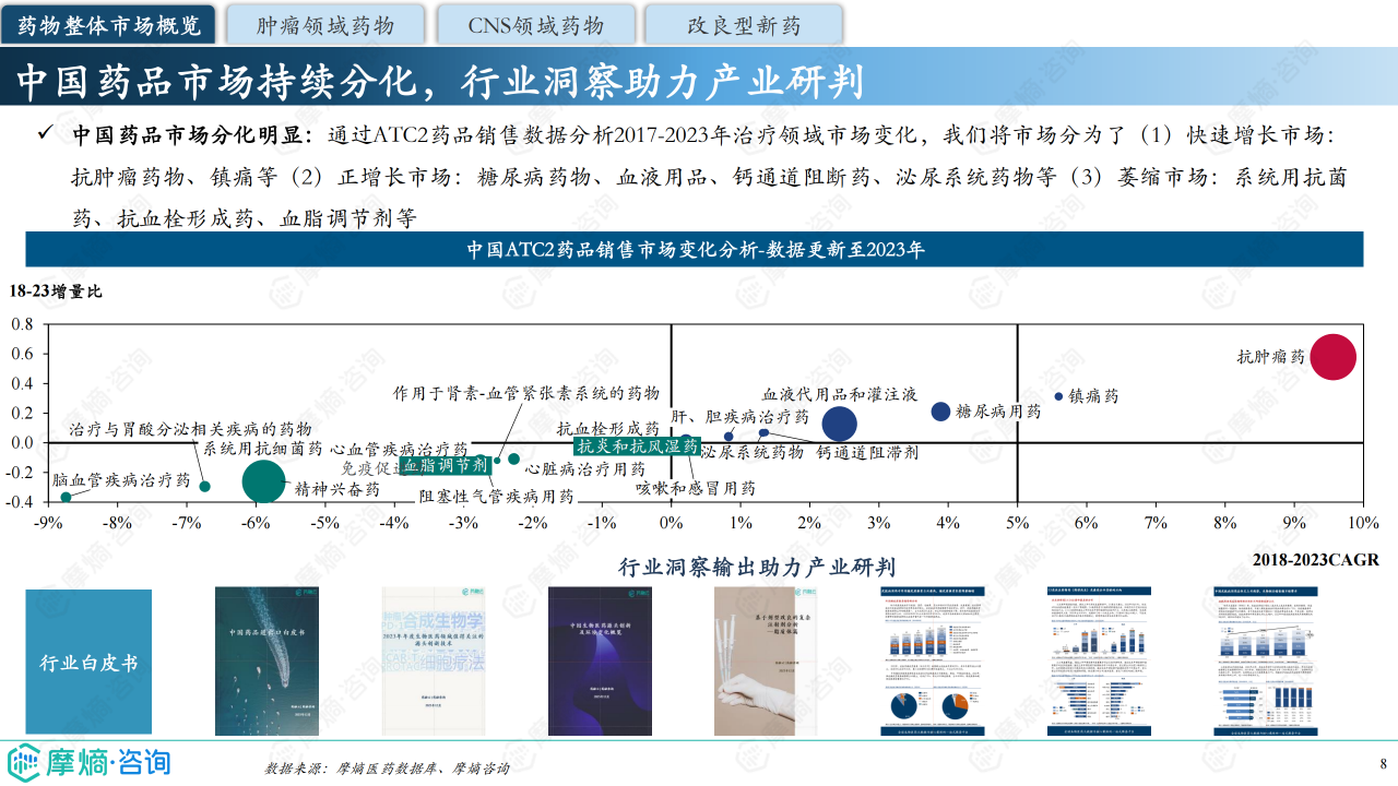 摩熵咨询2024年5月发布的报告《市场洞察,精准决策 医疗大数据赋能药企市场准入》对中国药物市场进行了全面分析,涵盖医院全终端、实体药店和网上药店三个主要销售渠道,并深入探讨了热门领域(抗肿瘤药物、CNS药物、改良型新药)的市场趋势及发展前景。报告数据显示,2023年中国药物市场整体呈现恢复性增长态势,但不同销售渠道和药物类型增长速度差异显著。 网上药店市场增速最快,达到30%;医院全终端市场整体药物销售恢复增长,但尚未恢复到2019年疫情前水平;实体药店市场增长相对平稳。 报告还利用医疗大数据,分析了市场竞争格局、产品定价策略、医保准入以及差异化营销策略等方面,为药企市场准入提供数据支持和决策参考。