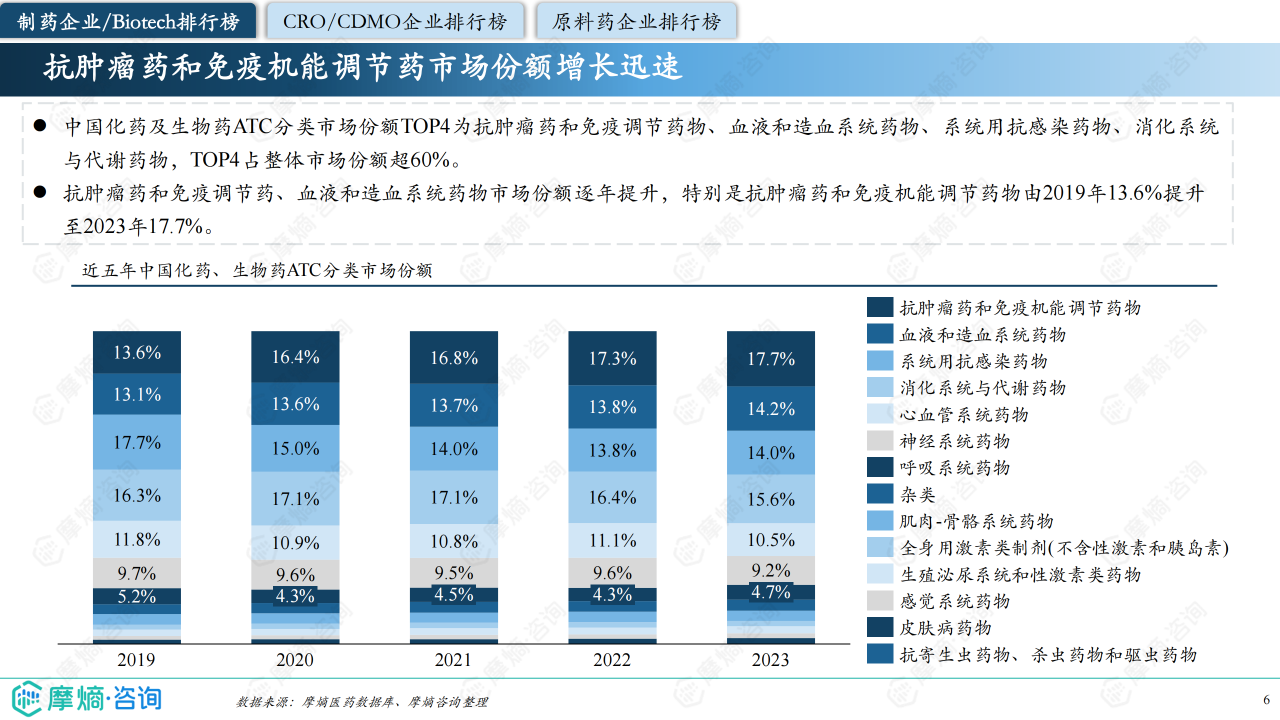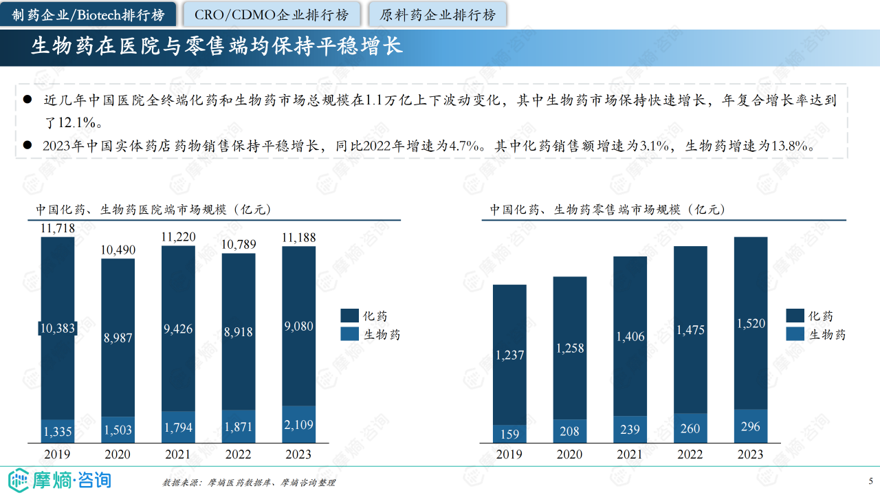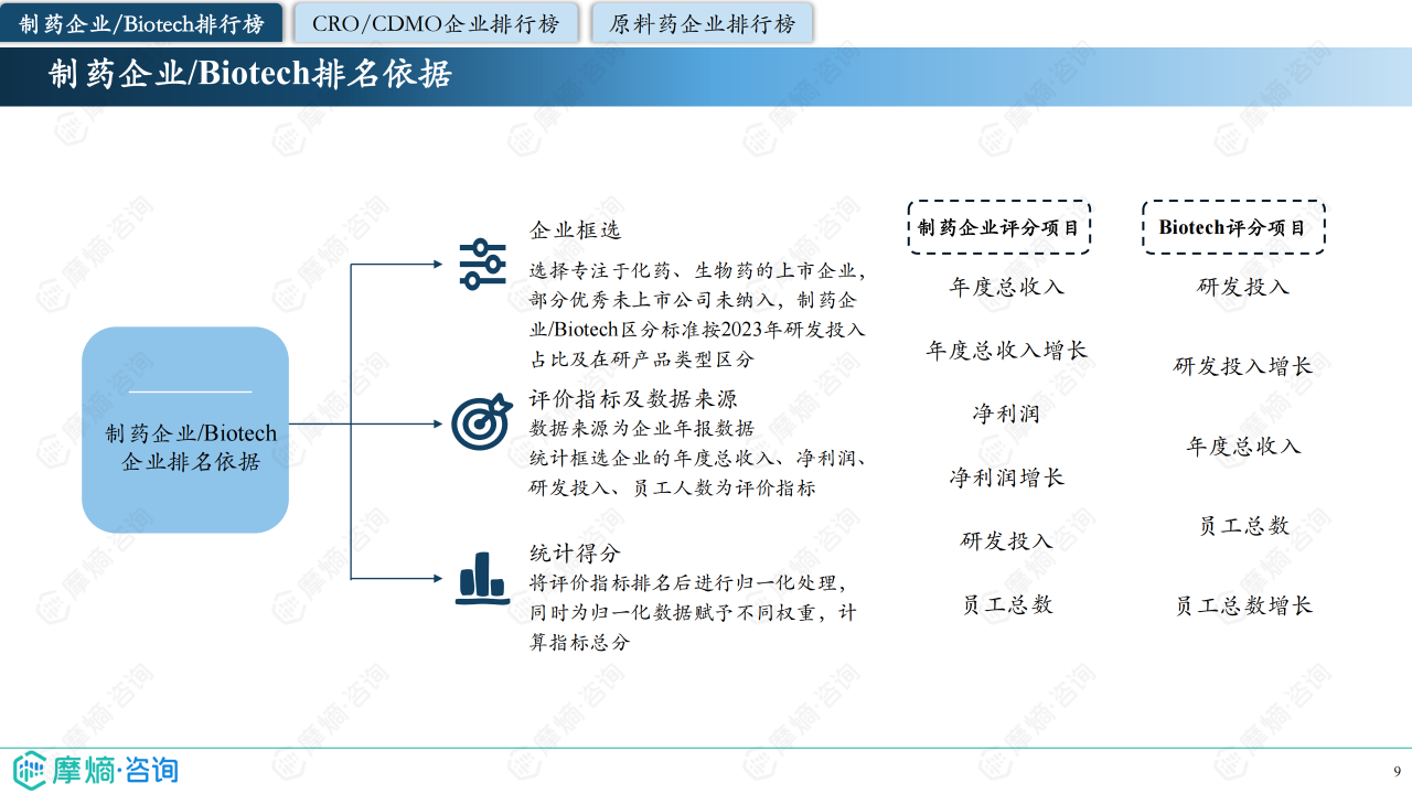 本报告基于摩熵咨询2024年8月发布的《2023年医药企业综合实力排行榜》数据,对中国医药市场进行分析,涵盖制药企业/Biotech、CRO/CDMO和原料药企业三个领域。报告重点关注市场规模、竞争格局、发展趋势以及各细分领域的排名情况。数据主要来源于摩熵医药数据库、NMPA以及企业年报。