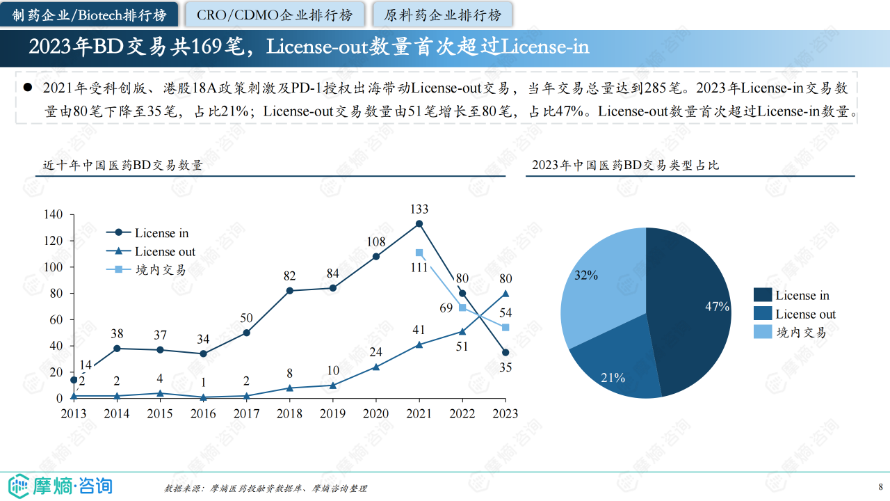 报告显示,中国临床试验和新药上市数量持续增加,这带动了CRO/CDMO市场的高速增长。 MAH制度的实施,将药品生产许可与上市许可分开管理,进一步促进了CDMO市场的蓬勃发展,为CDMO企业带来了更多的业务来源。 数据显示,B证企业数量在2021年至2022年间大幅增长,这直接反映了MAH制度对CDMO市场的影响。 License-out交易数量首次超过License-in数量,也体现了中国医药企业在国际市场上的竞争力提升。