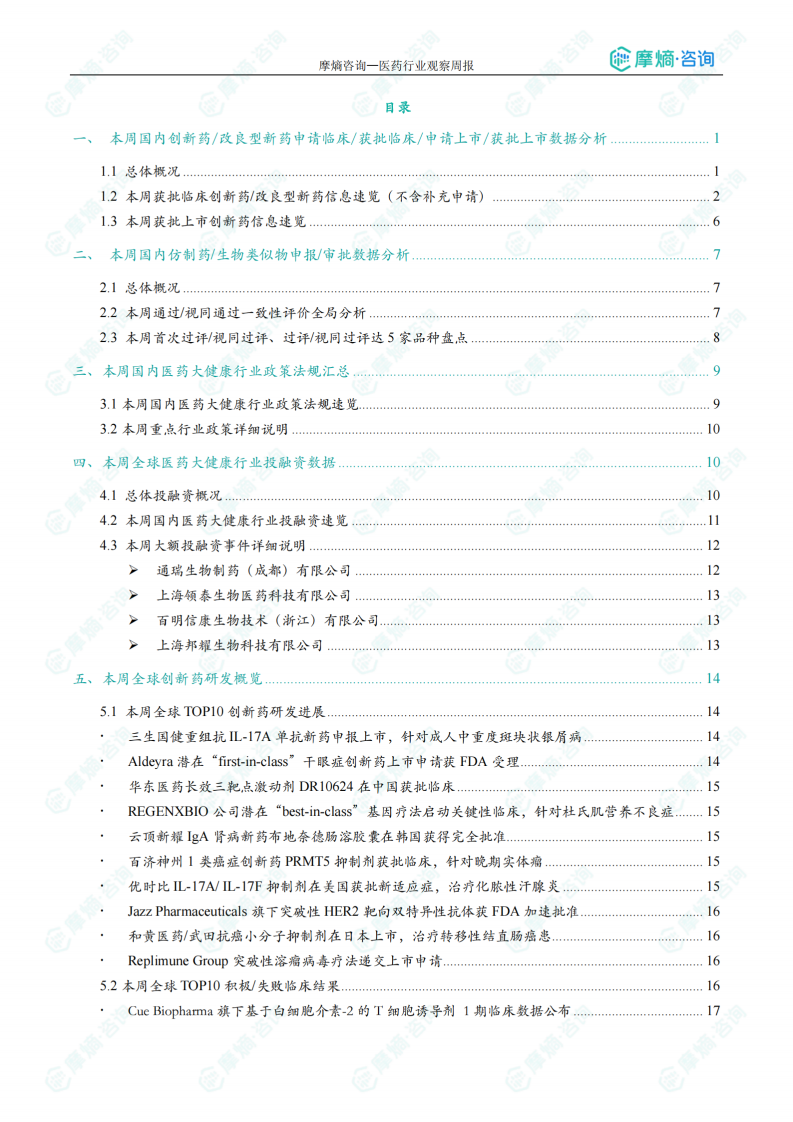 本报告根据摩熵咨询医药行业观察周报,从以下五个方面对医药市场进行数据分析: