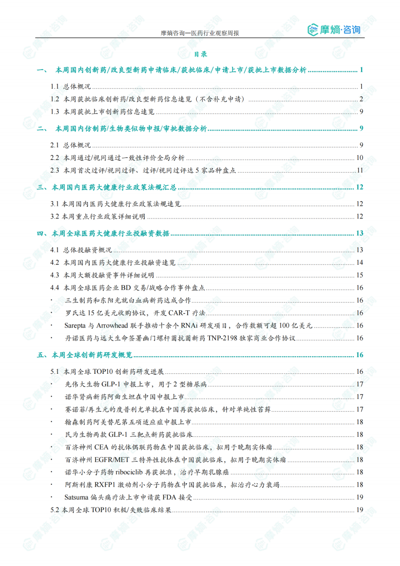 本报告基于摩熵咨询医药行业观察周报(2024.11.25-2024.12.01)的数据,对中国及全球医药大健康行业一周内的创新药研发、仿制药审批、政策法规、投融资以及BD合作等方面进行了统计分析,并对重点事件进行了深入解读。核心观点如下: