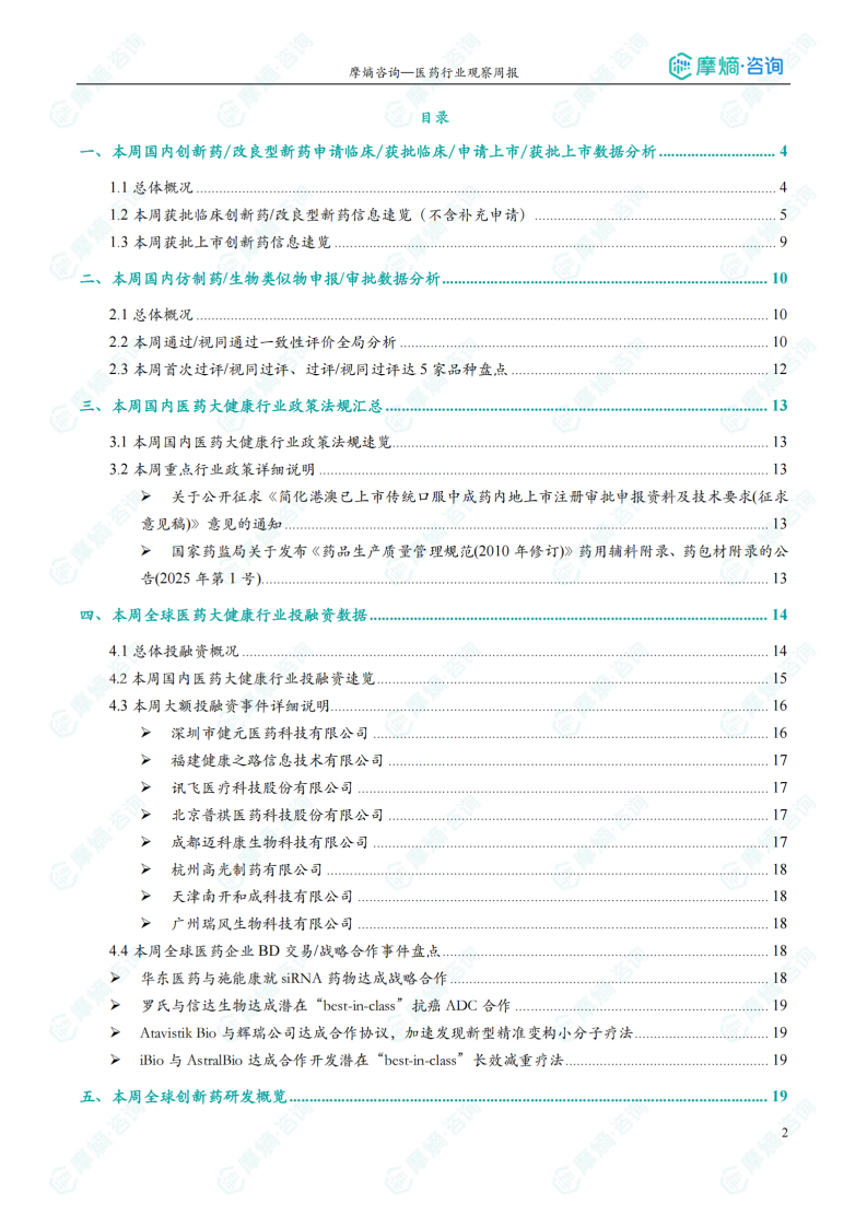 本报告基于摩熵咨询2024年12月30日至2025年1月5日医药行业观察周报数据,对国内外医药大健康行业在创新药研发、仿制药审批、政策法规、投融资以及BD交易等方面的市场动态进行统计分析,并对重点事件进行解读。核心观点如下: