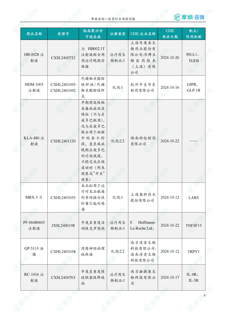 本节列出了本周获批上市的创新药信息,包括药品名称、受理号、适应症、注册类型、申报企业名称、承办日期以及作用机制等。数据显示,获批上市的创新药主要集中在抗肿瘤和抗病毒领域。