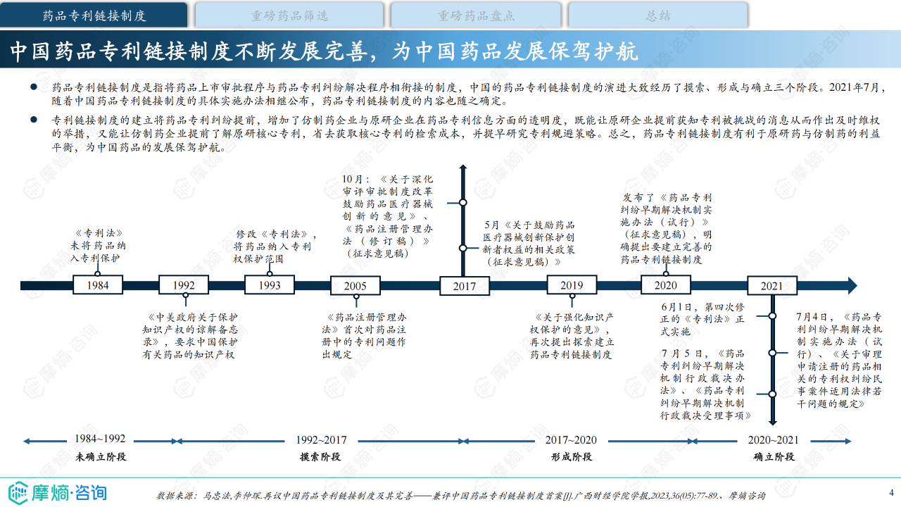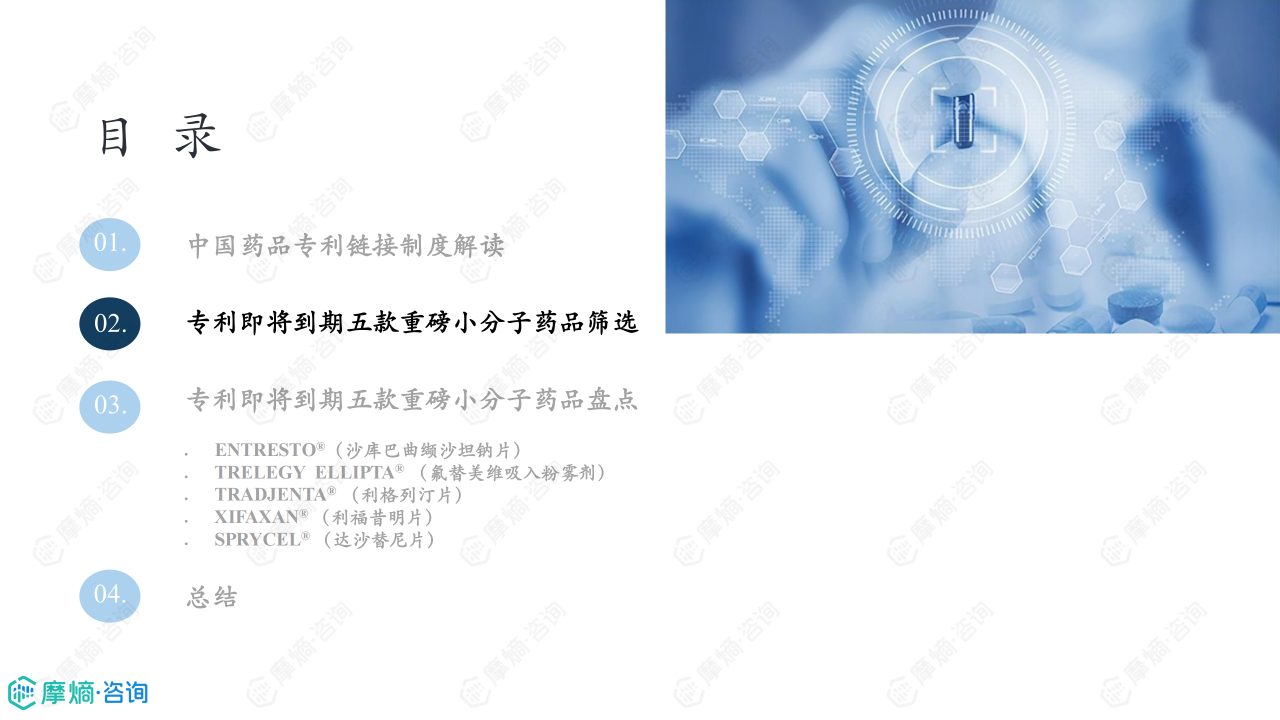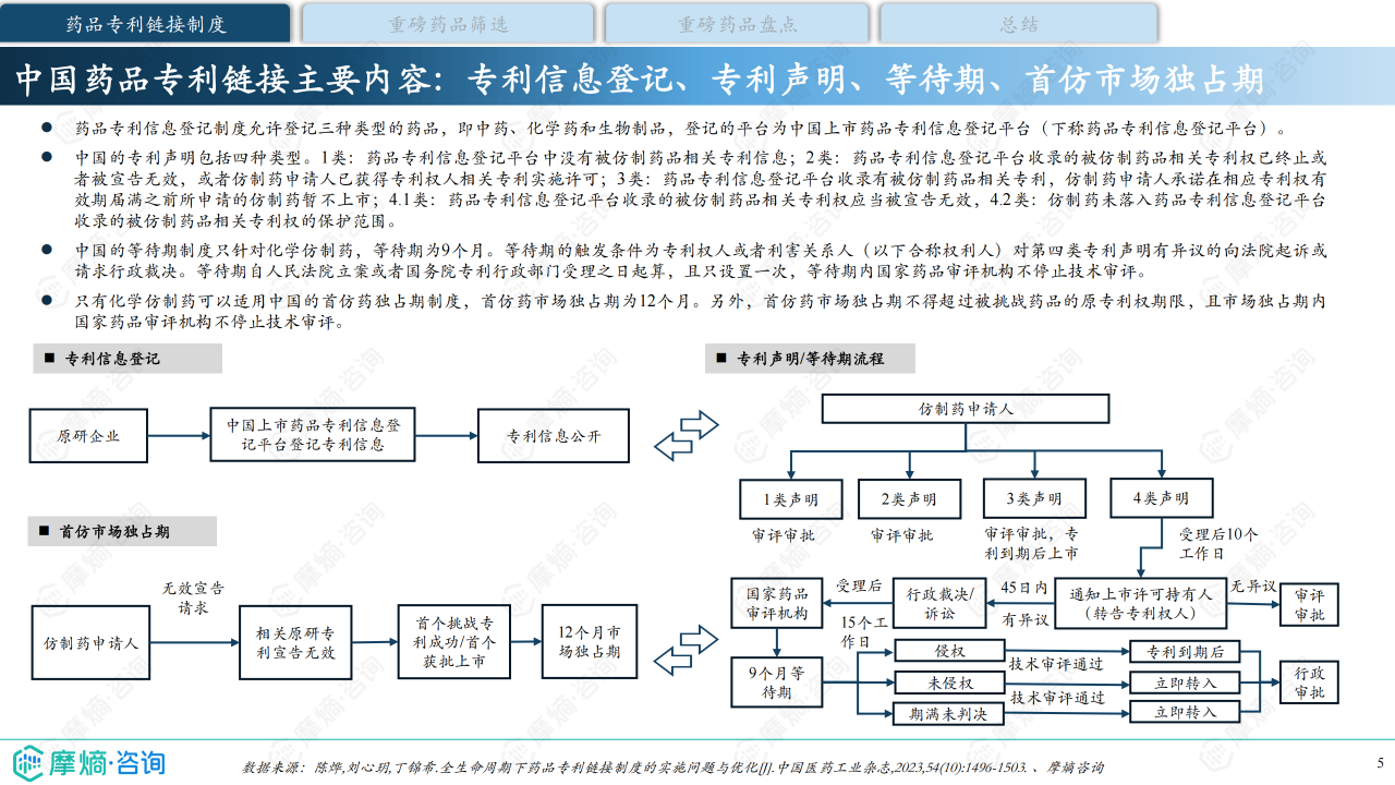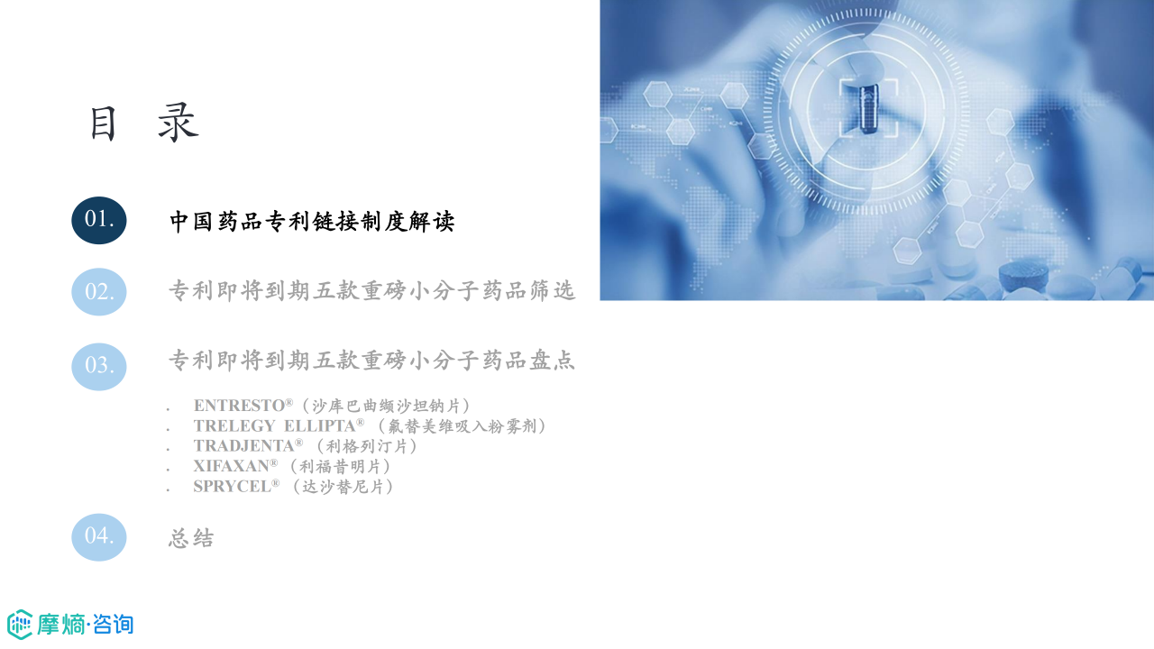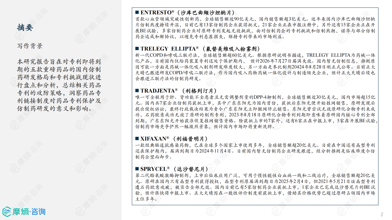 药品专利链接制度是指将药品上市审批程序与药品专利纠纷解决程序相衔接的制度,专利链接制度的建立将药品专利纠纷提前,增加了仿制药企业与原研企业在药品专利信息方面的透明度,既能让原研企业提前获知专利被挑战的消息从而作出及时维权的举措,又能让仿制药企业提前了解原研核心专利,省去获取核心专利的检索成本,并提早研究专利规避策略。本研究报告旨在对专利即将到期的五款重磅药品的国内仿制药研发格局和专利挑战现状进行盘点和分析,总结相关药品专利的攻防策略,洞察药品专利链接制度对药品专利保护及仿制药研发的意义和影响。