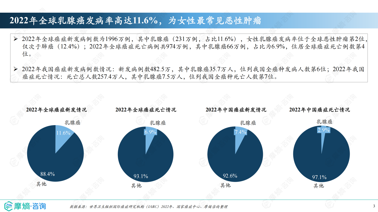 本报告基于摩熵咨询2024年10月发布的《市场研究专题报告五 乳腺癌药物》进行分析,利用报告中提供的流行病学数据、诊疗指南及药物市场数据,对乳腺癌药物市场竞争格局和未来趋势进行专业分析。报告数据主要来源于世界卫生组织国际癌症研究机构(IARC)、国家癌症中心、Lancet Public Health以及摩熵医药销售数据库等。