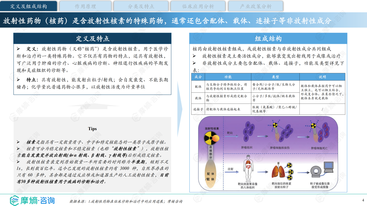 放射性药物(又称“核药”)是含放射性核素,用于医学诊断和治疗的一类特殊药物。它不仅具有药物的特点,还具有放射性,可广泛用于肿瘤的诊疗、心脏疾病的诊断、神经退行性疾病的早期发现和炎症组织的诊断等。本研究报告旨在对中国放射性药物市场现状进行深入分析,围绕核药行业概览、核药产业链全景、核药市场规模及竞争现状、核药研发现状4个维度进行系统阐述,揭示行业市场发展概况,挖掘行业增长潜力,展望中国核药的广阔市场前景。
