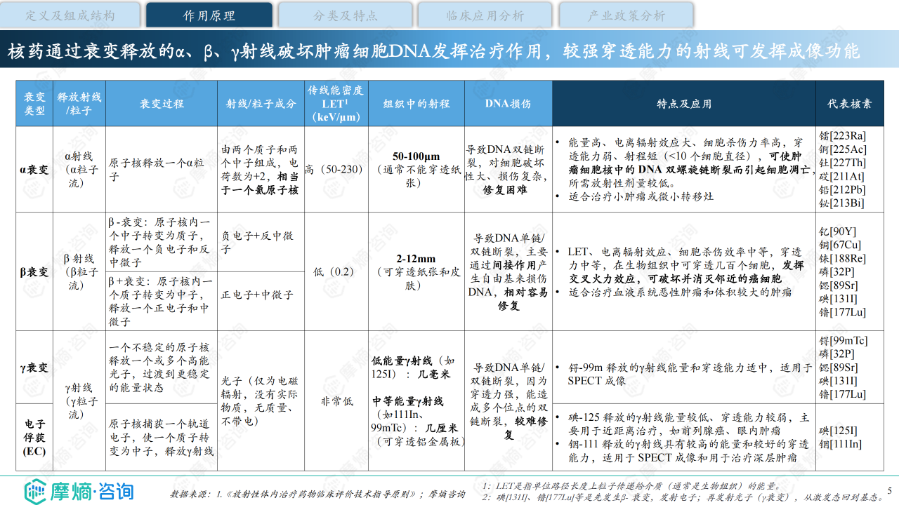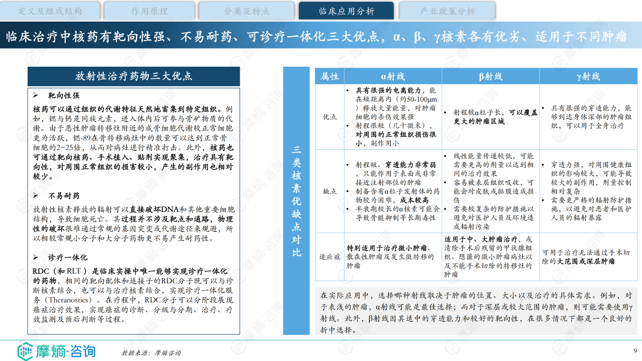 报告首先对核药进行定义,指出其为含放射性核素的特殊药物,用于医学诊断和治疗。其作用原理是利用放射性核素衰变释放的α、β、γ射线破坏肿瘤细胞DNA或进行影像诊断。根据用途,核药分为诊断类、治疗类和诊疗一体类。诊断类核药主要利用半衰期短、射线穿透力强的放射性核素(如18F)结合PET/SPECT设备进行显像;治疗类核药则利用不同核素(如90Y、177Lu、223Ra)的射线特性进行靶向治疗;诊疗一体类核药(如RDC)则结合了诊断和治疗功能,实现精准诊疗。报告还强调了核药的靶向性强、不易耐药、可诊疗一体化三大优点。