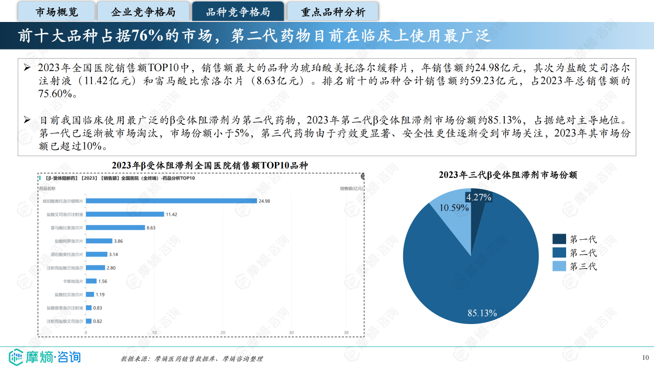 2023年,市场上共有32个β受体阻滞剂品种。第二代选择性β1受体阻滞剂占据绝对主导地位,市场份额约为85.13%。第一代非选择性β受体阻滞剂由于副作用较大,市场份额已不足5%。第三代和第四代药物疗效更优、安全性更高,市场份额也在逐步提升,2023年已超过10%。 然而,国家药品集中采购(集采)政策对市场格局产生了显著影响。美托洛尔和比索洛尔等品种在集采后市场份额下降,而艾司洛尔和阿罗洛尔等品种的市场份额则快速提升。 前十大品种占据了76%的市场份额,其中琥珀酸美托洛尔缓释片、盐酸艾司洛尔注射液和富马酸比索洛尔片位列前三。