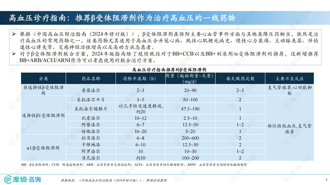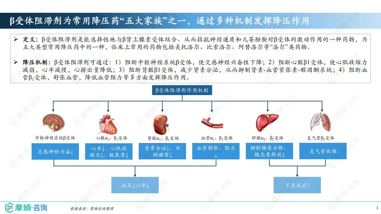 β受体阻滞剂是五大类常用降压药之一,通过多种机制发挥降压作用,临床上常用药物包括美托洛尔、比索洛尔、阿替洛尔等“洛尔”类药物。其作用机制包括阻断中枢神经系统β受体、心脏β1受体、肾脏β1受体和血管β受体等,从而降低心率、心肌收缩力、肾素分泌和血管阻力,最终达到降压效果。目前市场上β受体阻滞剂已发展至四代,其中第二代选择性β1受体阻滞剂应用最为广泛。2024年版《中国高血压防治指南》仍推荐β受体阻滞剂作为治疗高血压的一线药物,尤其适用于高血压合并其他心血管疾病的患者。