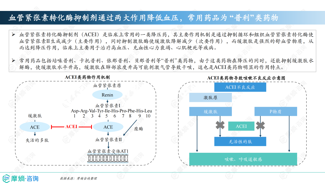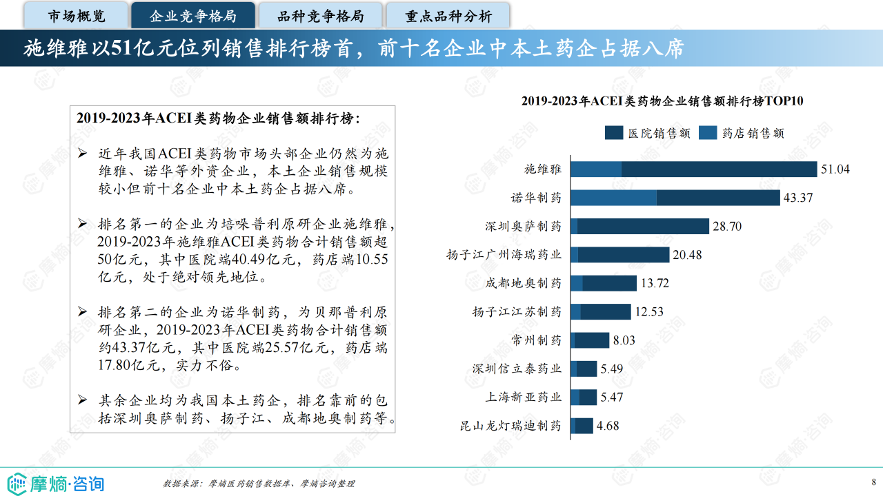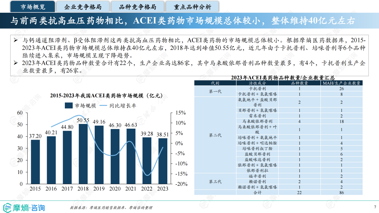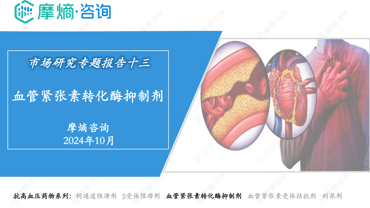 本报告基于摩熵咨询2024年10月发布的《市场研究专题报告十三 血管紧张素转化酶抑制剂》进行分析,重点关注血管紧张素转化酶抑制剂(ACEI)的市场竞争格局和市场趋势。报告数据主要来源于摩熵医药销售数据库,涵盖医院、药店等多个销售渠道,并结合《中国高血压防治指南(2024年修订版)》等权威资料。报告指出,ACEI类药物市场规模相对较小,但竞争激烈,主要由几家大型企业主导,且市场格局受国家集采政策影响显著。