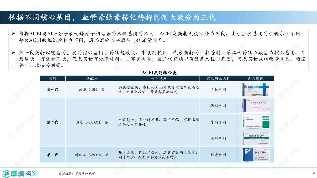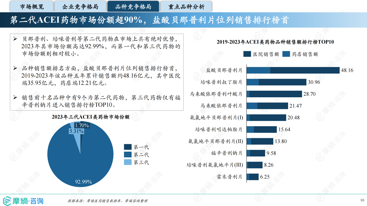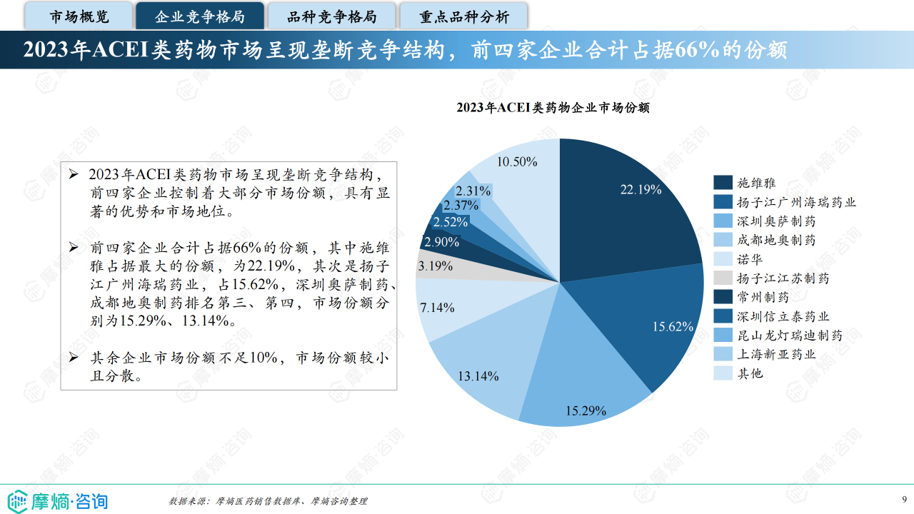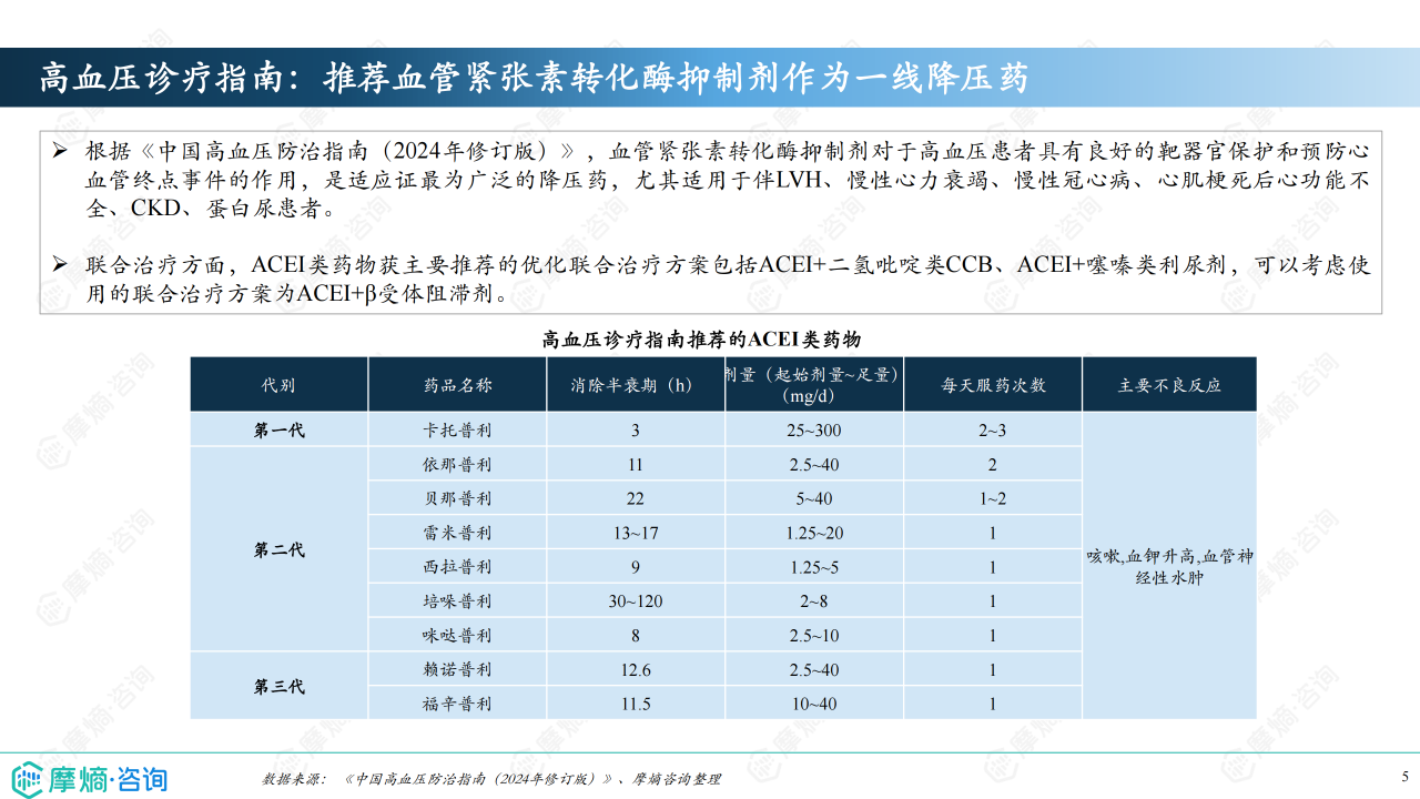 本报告基于摩熵咨询2024年10月发布的《市场研究专题报告十三 血管紧张素转化酶抑制剂》进行分析,重点关注血管紧张素转化酶抑制剂(ACEI)的市场竞争格局和市场趋势。报告数据主要来源于摩熵医药销售数据库,涵盖医院、药店等多个销售渠道,并结合《中国高血压防治指南(2024年修订版)》等权威资料。报告指出,ACEI类药物市场规模相对较小,但竞争激烈,主要由几家大型企业主导,且市场格局受国家集采政策影响显著。