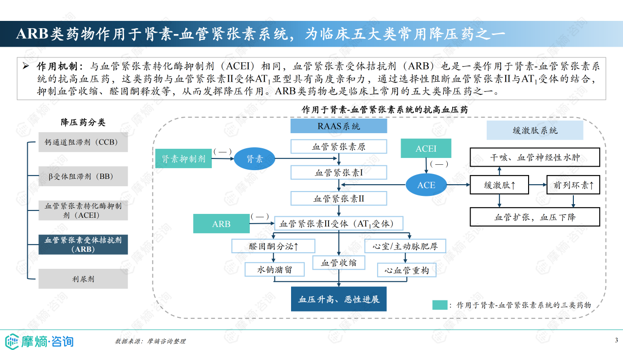 血管紧张素受体拮抗剂(ARB)是一类作用于肾素-血管紧张素系统的抗高血压药,这类药物与血管紧张素Ⅱ受体AT1亚型具有高度亲和力,通过选择性阻断血管紧张素Ⅱ与AT1受体的结合,抑制血管收缩、醛固酮释放等,从而发挥降压作用。ARB类药物也是临床上常用的五大类降压药之一。本报告将从血管紧张素受体拮抗剂概述和血管紧张素受体拮抗剂市场竞争格局分析两大方面进行全面分析,为理解中国血管紧张素受体拮抗剂药物市场的现状和未来趋势提供了深入的视角。