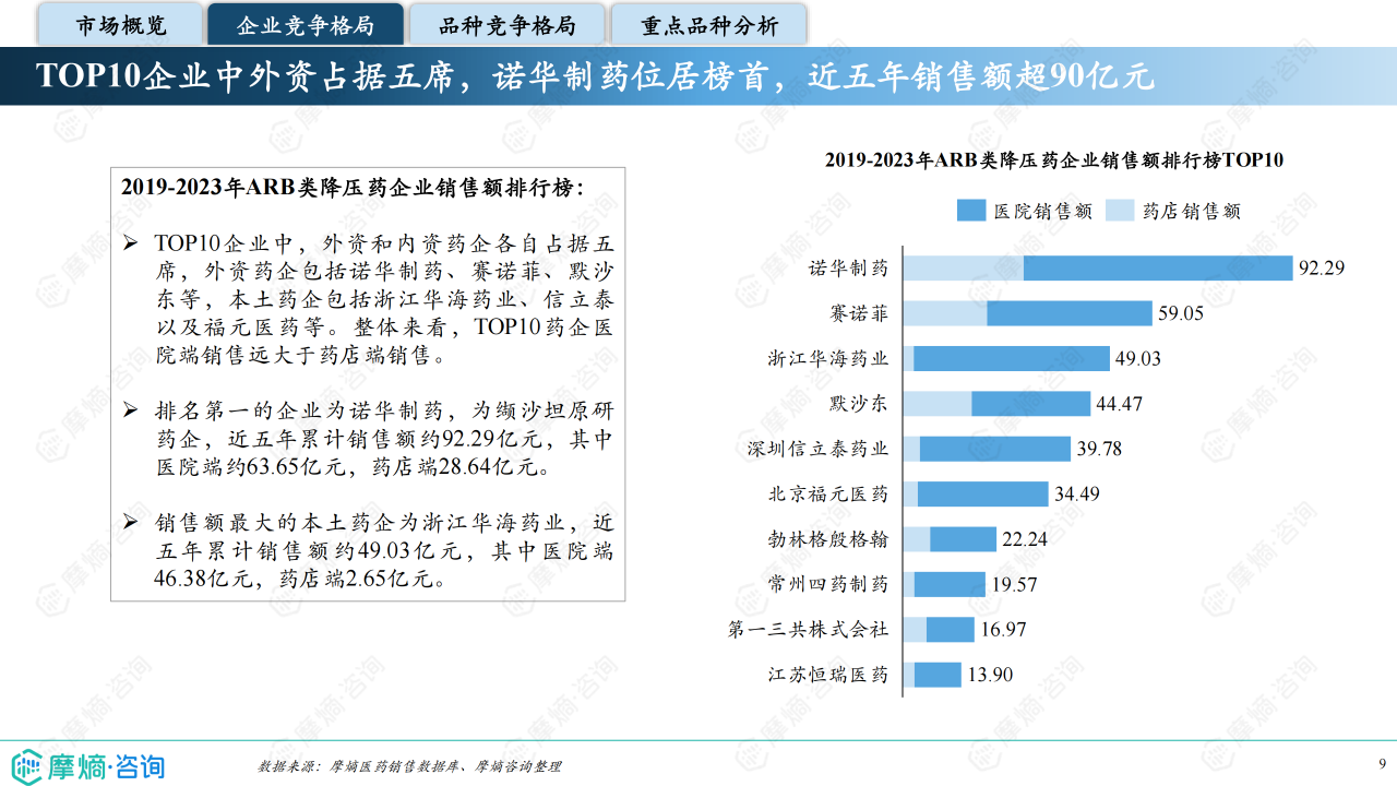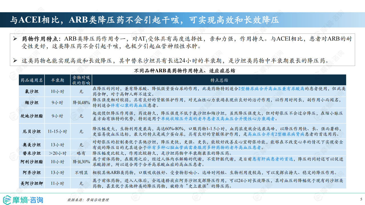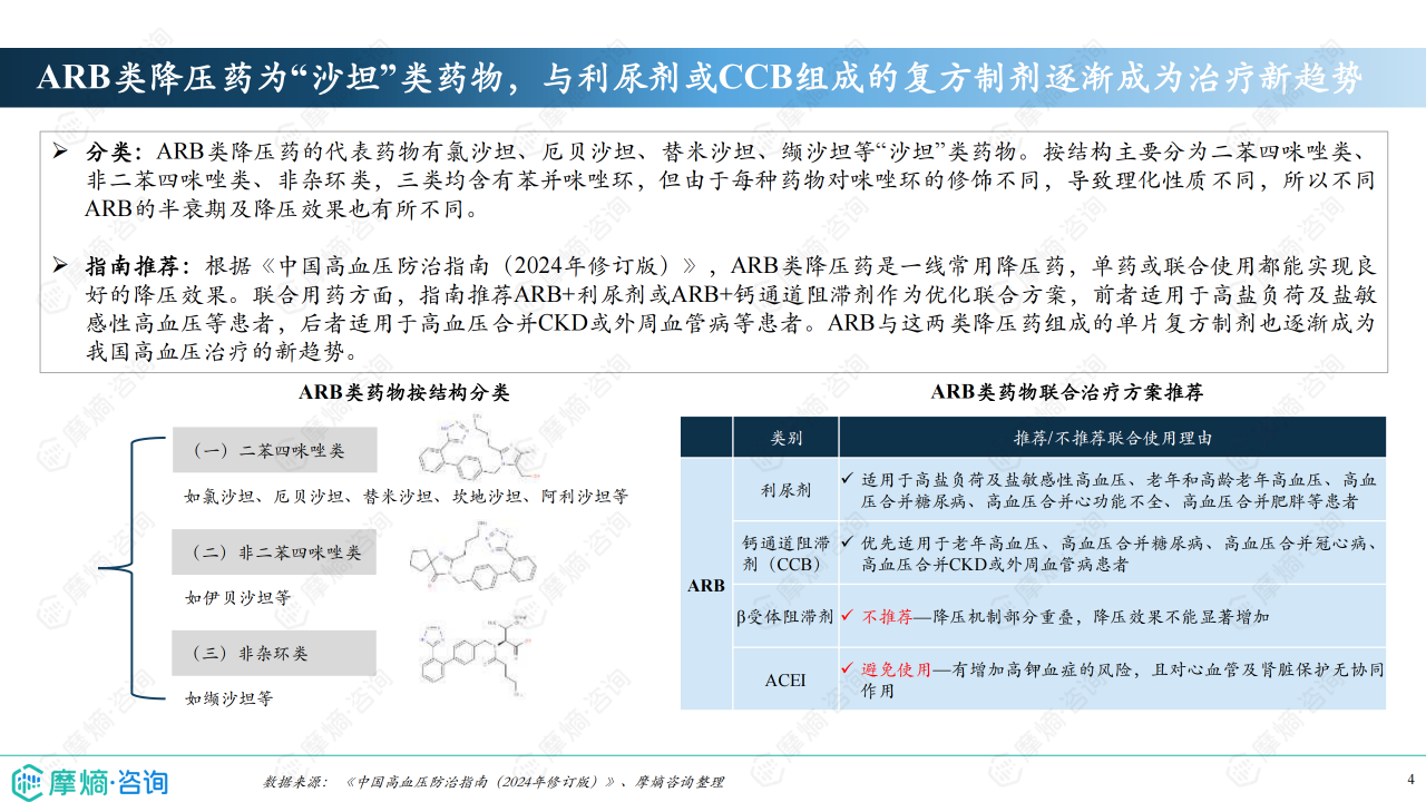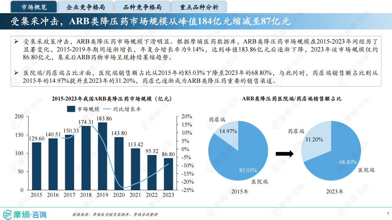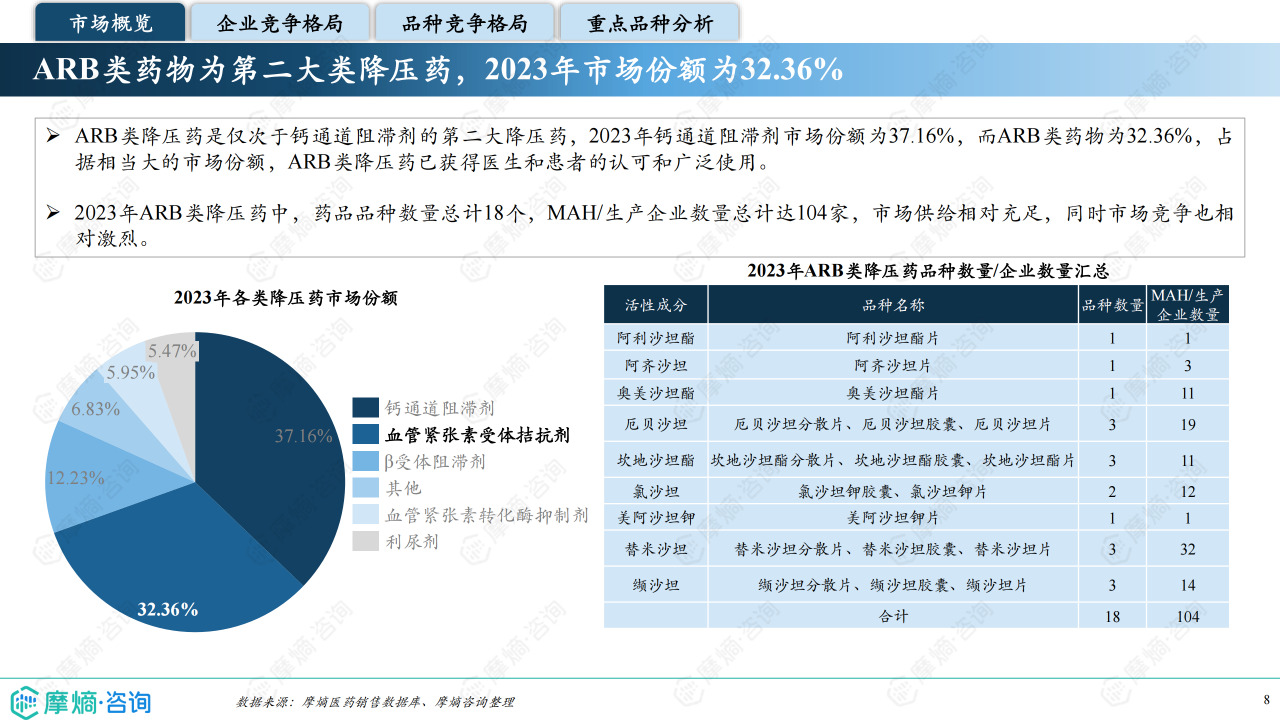 本报告基于摩熵咨询2024年10月发布的《市场研究专题报告十四 血管紧张素受体拮抗剂》进行分析,重点关注血管紧张素受体拮抗剂(ARB)类药物的市场竞争格局和市场趋势。报告数据主要来源于摩熵医药销售数据库,涵盖医院和药店渠道,并结合《中国高血压防治指南(2024年修订版)》等权威资料。报告显示,ARB类药物市场规模在集采政策影响下有所萎缩,但仍占据抗高血压药物市场较大份额,市场竞争激烈,且呈现出明显的品牌和品种差异化竞争态势。