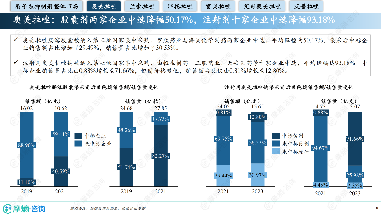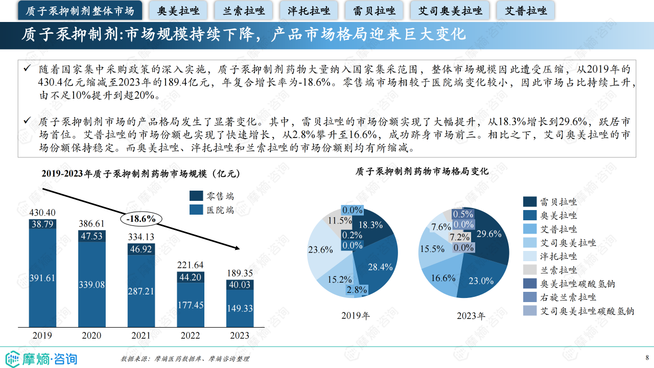 本报告基于摩熵咨询2024年11月发布的《市场研究专题报告十九 质子泵抑制剂》进行分析,重点关注质子泵抑制剂(PPI)市场竞争格局及市场趋势。报告数据主要来源于摩熵医药数据库,并结合GBD数据进行补充。报告指出,在国家集中采购政策影响下,PPI市场规模持续下降,但市场竞争格局发生显著变化,部分产品市场份额大幅提升。