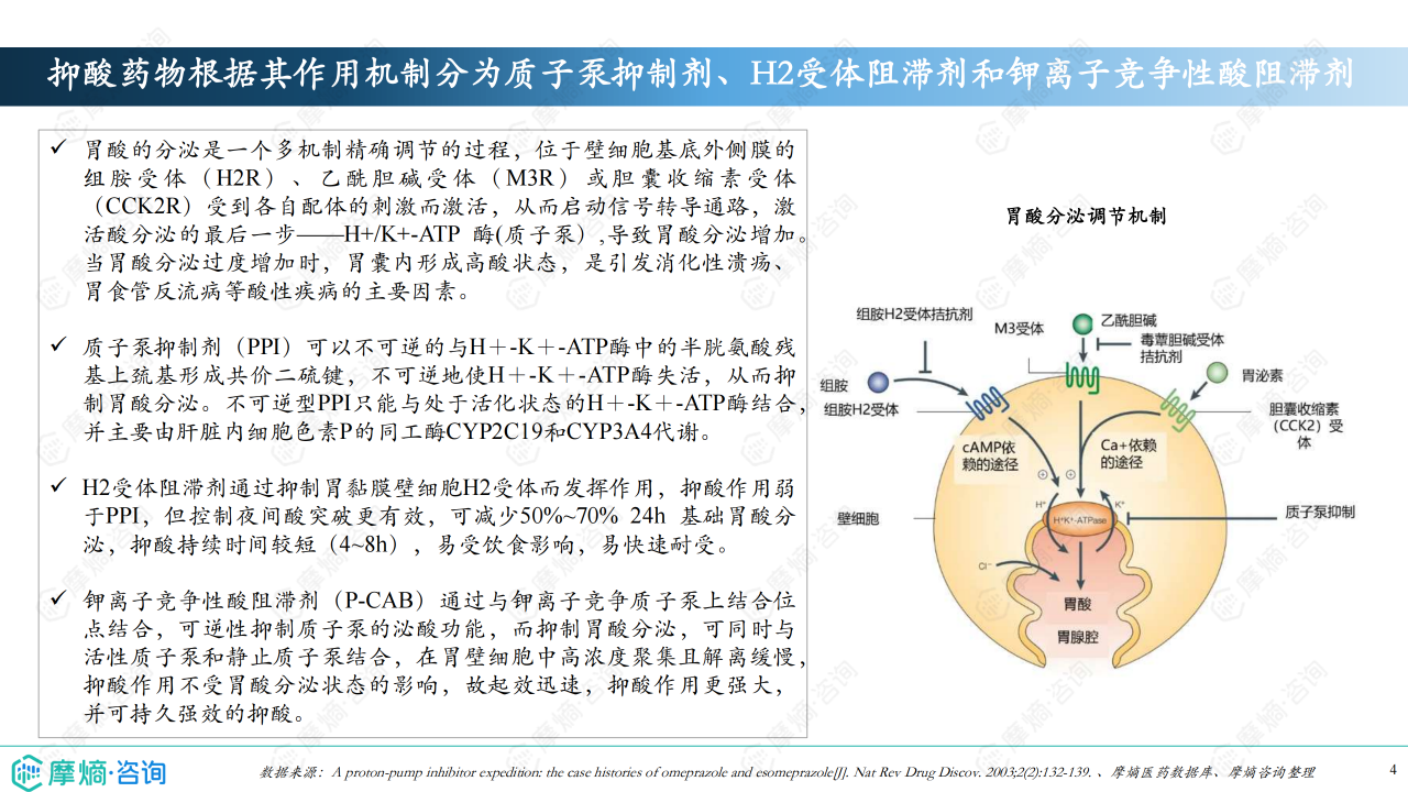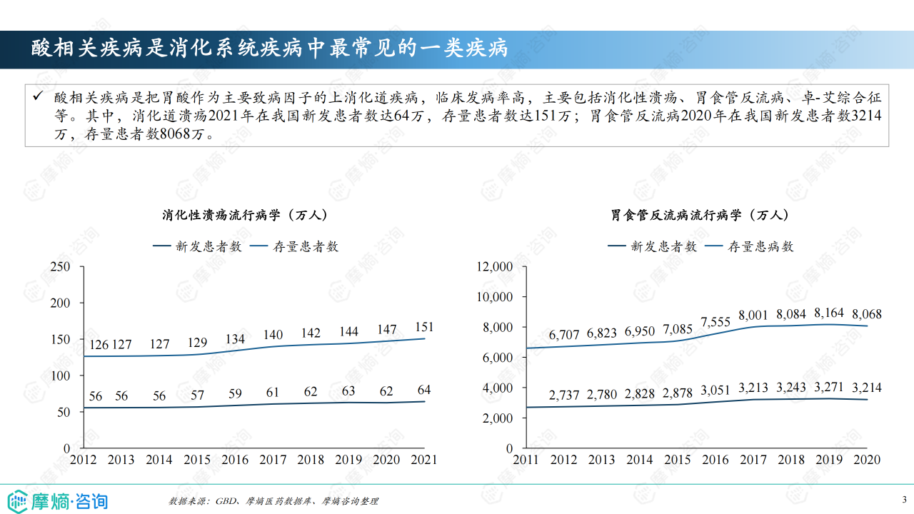 酸相关疾病是把胃酸作为主要致病因子的上消化道疾病,主要包括消化性溃疡、胃食管反流病、卓-艾综合征等。其中,消化道溃疡2021年在我国新发患者数达64万,胃食管反流病2020年在我国新发患者数3214万。质子泵抑制剂是目前世界上应用最广的抑酸药物,分为一代和二代质子泵。本报告将深入分析质子泵的市场竞争格局,为理解质子泵抑酸药物市场的现状和未来趋势提供深入的视角。