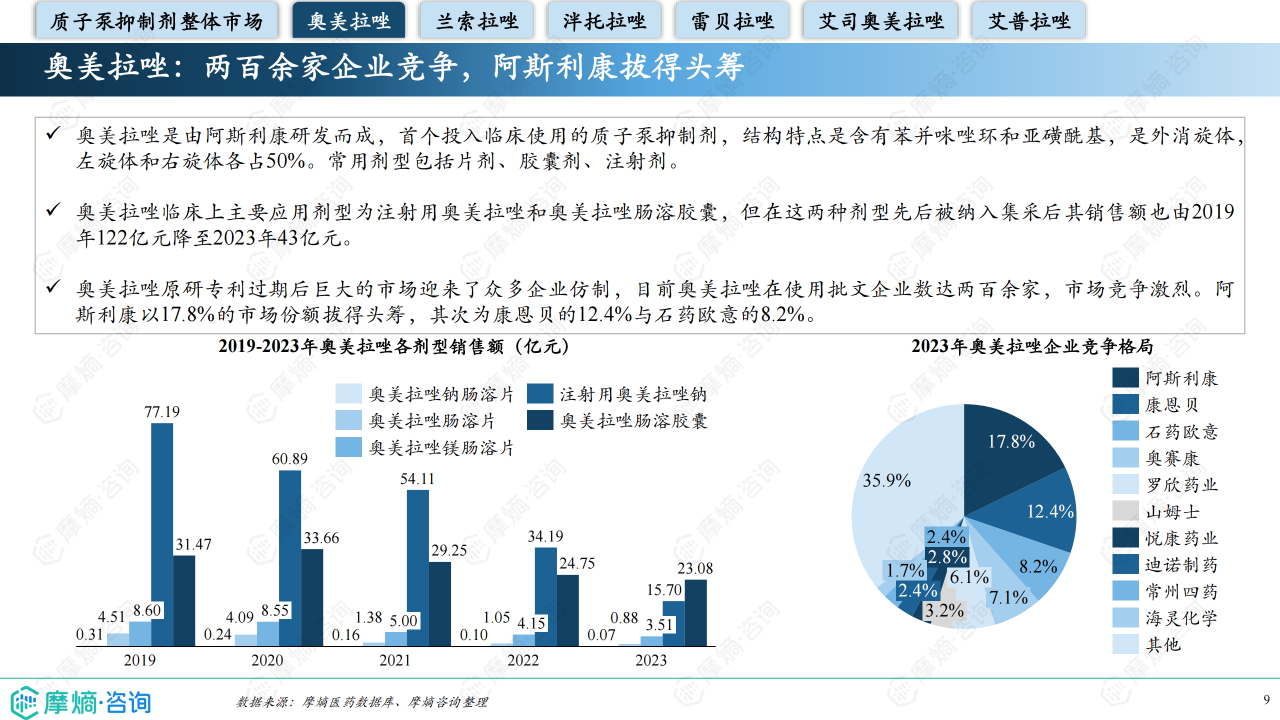 本报告涉及: 相关药物:奥美拉唑, 相关靶点:质子泵, 相关适应症:消化性溃疡、胃食管反流、卓-艾综合征 。