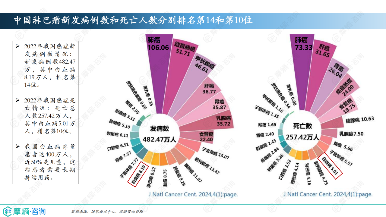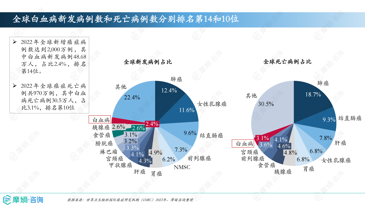 白血病是一种起源于骨髓的恶性血液肿瘤,导致异常白血球增生。根据白血球类型和病程的不同,可分为急性和慢性白血病。症状包括贫血、易感染、出血等。早期诊断和治疗对预后至关重要。2022年全球新增癌症病例数达到2,000万例,其中白血病新发病例48.68万人。2022年我国癌症新发病例数482.47万,其中白血病8.19万人。本报告从白血病流行病学数据、诊疗指南、市场竞争格局及市场趋势等多方面进行了深入分析,为理解白血病药物市场的现状和未来趋势提供了深入的视角。