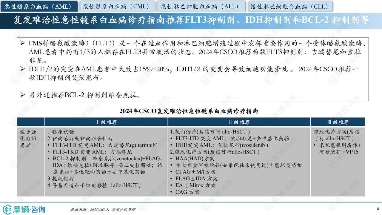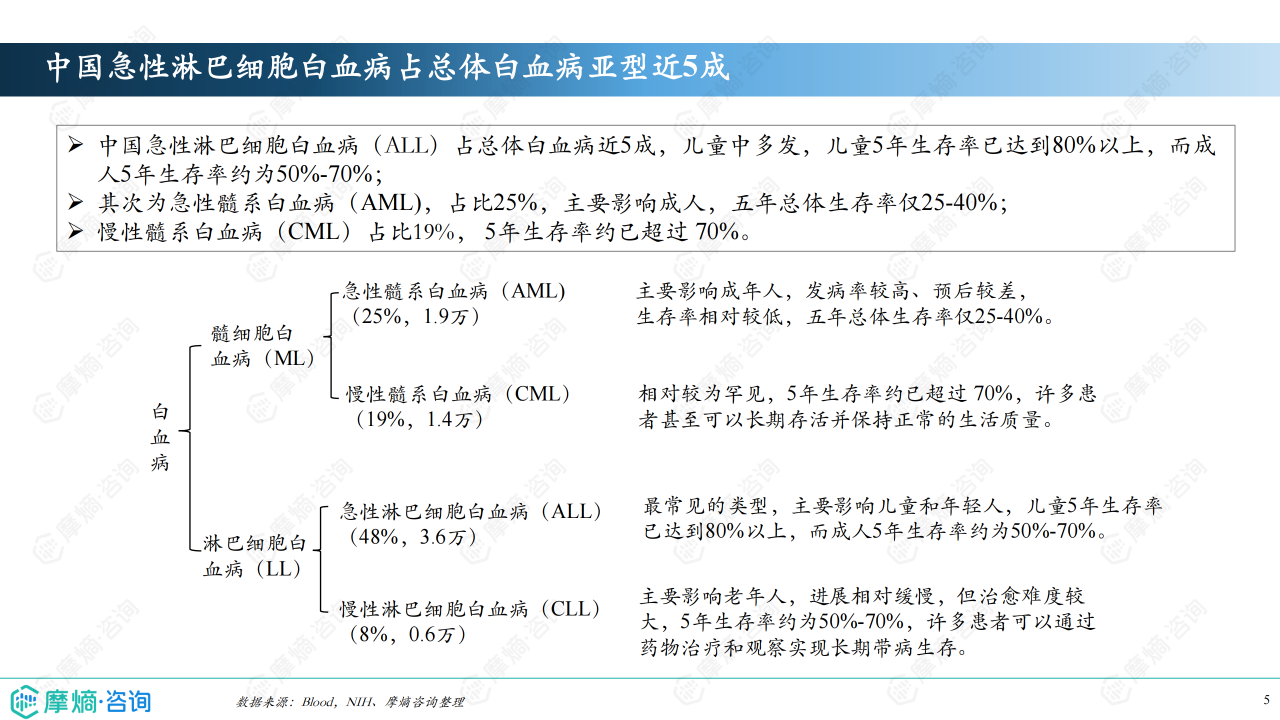 报告数据显示,中国白血病患者中,急性淋巴细胞白血病(ALL)占比近50%,急性髓系白血病(AML)占比25%,慢性髓系白血病(CML)占比19%,慢性淋巴细胞白血病(CLL)占比8%。不同亚型的治疗药物及市场竞争格局差异显著。