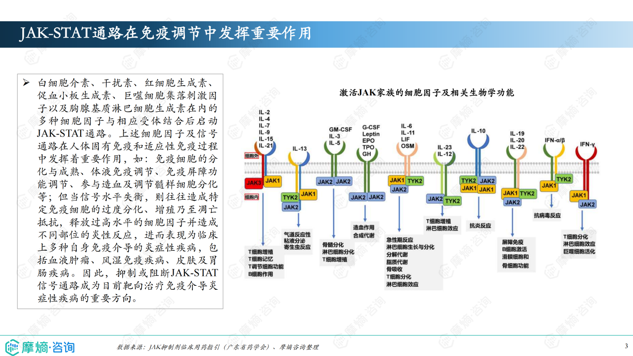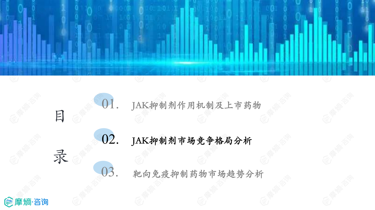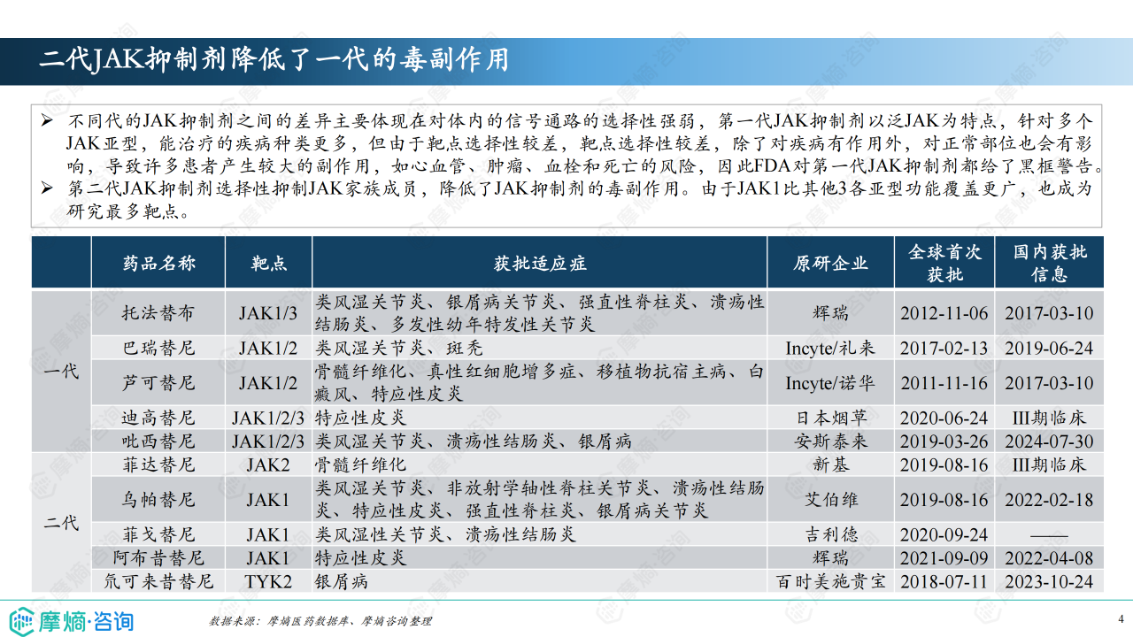 本报告基于摩熵咨询2024年12月发布的《市场研究专题报告二十九 自免药物(JAK抑制剂篇)》进行分析,重点关注JAK抑制剂的市场竞争格局和市场趋势。报告数据主要来源于摩熵医药数据库以及公开的临床指南和文献。 JAK抑制剂作为一类靶向JAK-STAT信号通路的药物,在治疗多种自身免疫性疾病方面展现出显著疗效,但其市场仍处于发展阶段,存在着巨大的市场潜力和竞争压力。本分析将结合市场规模、产品竞争、医保政策以及新药研发等方面,对JAK抑制剂市场进行深入解读。