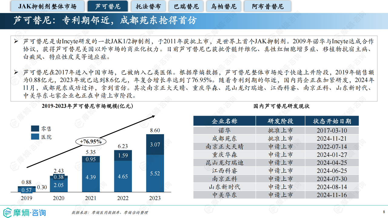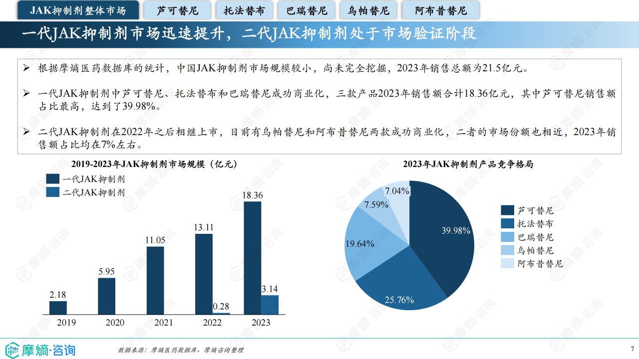 报告详细分析了芦可替尼、托法替布、巴瑞替尼、乌帕替尼和阿布昔替尼五款主要JAK抑制剂的市场表现。