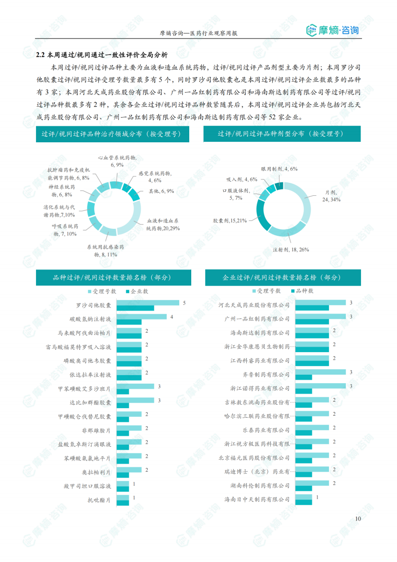 报告对本周通过/视同通过一致性评价的品种进行了全局分析,包括治疗领域分布、剂型分布以及品种和企业数量排名等,并对重点品种进行了详细介绍。 数据显示,本周过评/视同过评品种主要为血液和造血系统药物,剂型主要为片剂。罗沙司他胶囊过评/视同过评受理号数量最多。