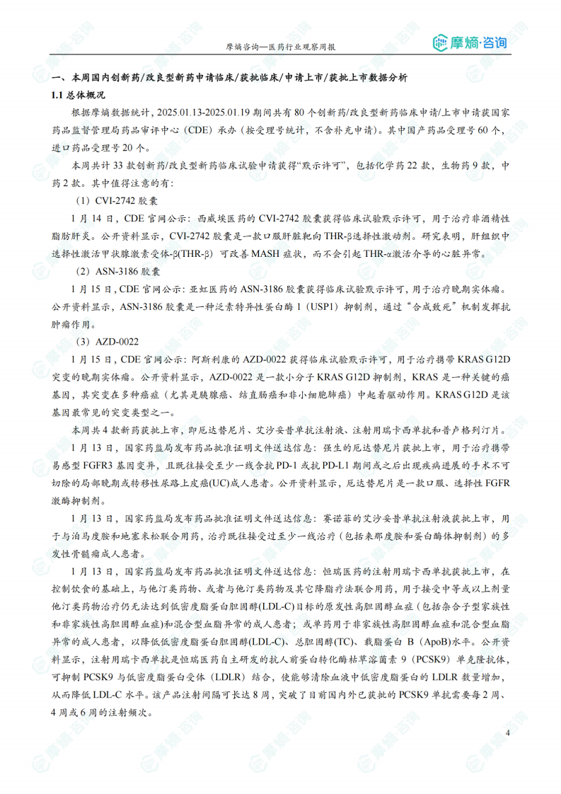 本报告基于摩熵咨询2025年1月13日至1月19日医药行业观察周报数据,对国内外创新药、改良型新药及仿制药的研发、审批和上市情况进行统计分析,并对相关政策法规进行解读。报告核心观点如下: