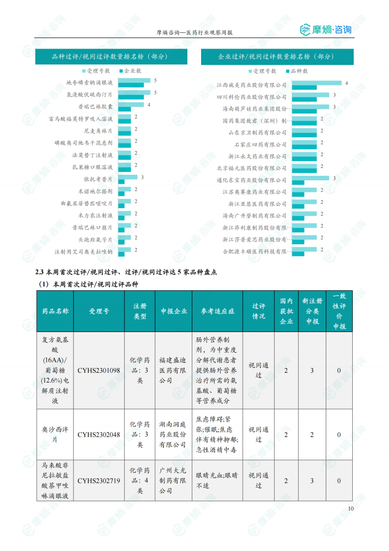 本周过评/视同过评品种主要为消化系统与代谢药物,剂型主要为片剂。地夸磷索钠滴眼液和氢溴酸伏硫西汀片过评/视同过评受理号数量最多,均为5个。江西施美药业股份有限公司、四川科伦药业股份有限公司和海南葫芦娃药业集团股份有限公司等过评/视同过评品种数最多。报告还对过评/视同过评品种的治疗领域分布和剂型分布进行了统计分析。