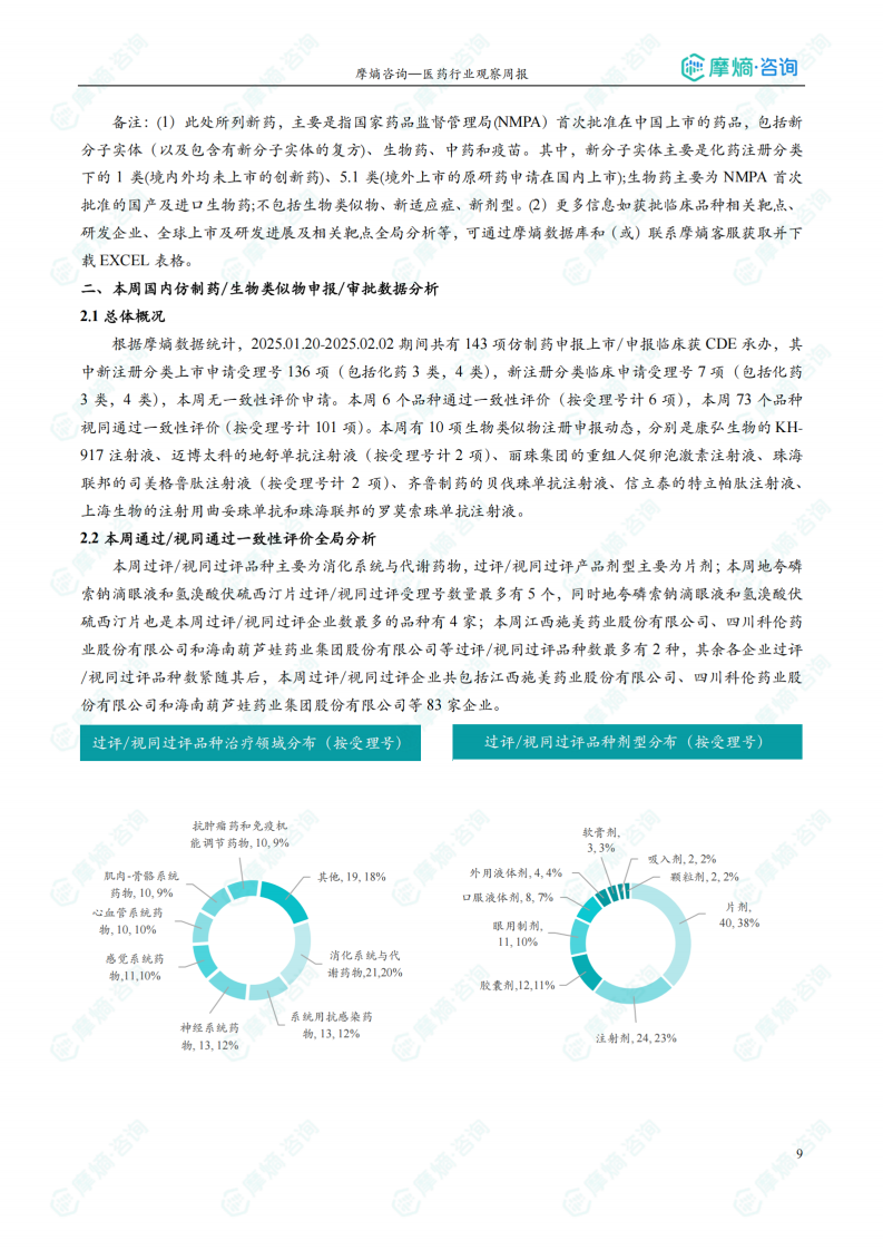 本报告基于摩熵咨询2025年1月20日至2月2日的医药行业观察周报数据,对中国及全球医药市场创新药、仿制药及相关政策法规进行统计分析,重点关注创新药临床获批及上市情况、仿制药一致性评价进展以及全球创新药研发动态。报告核心观点如下: