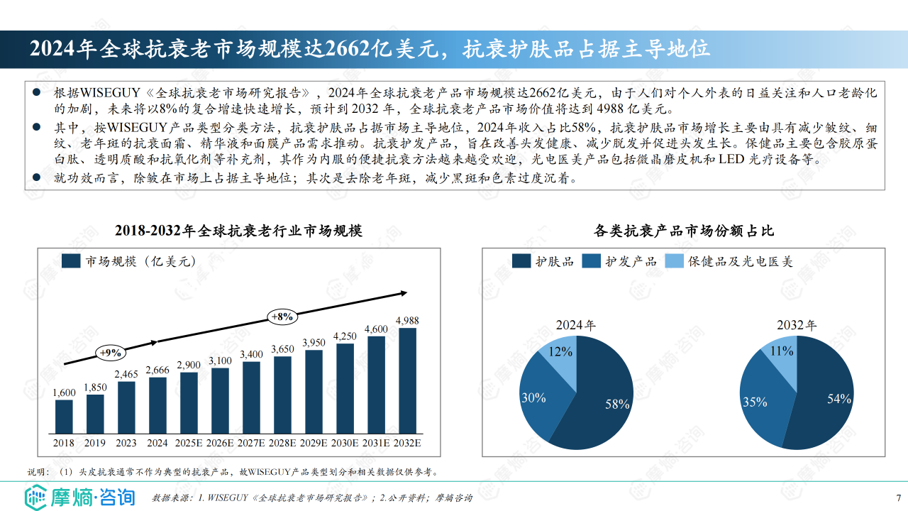 2024年全球抗衰老市场规模达2662亿美元,抗衰护肤品占据主导地位(占比58%)。中国抗衰老市场规模超2000亿元,护肤品、保健品、医美为三大支柱,其中抗衰护肤品占比最大。