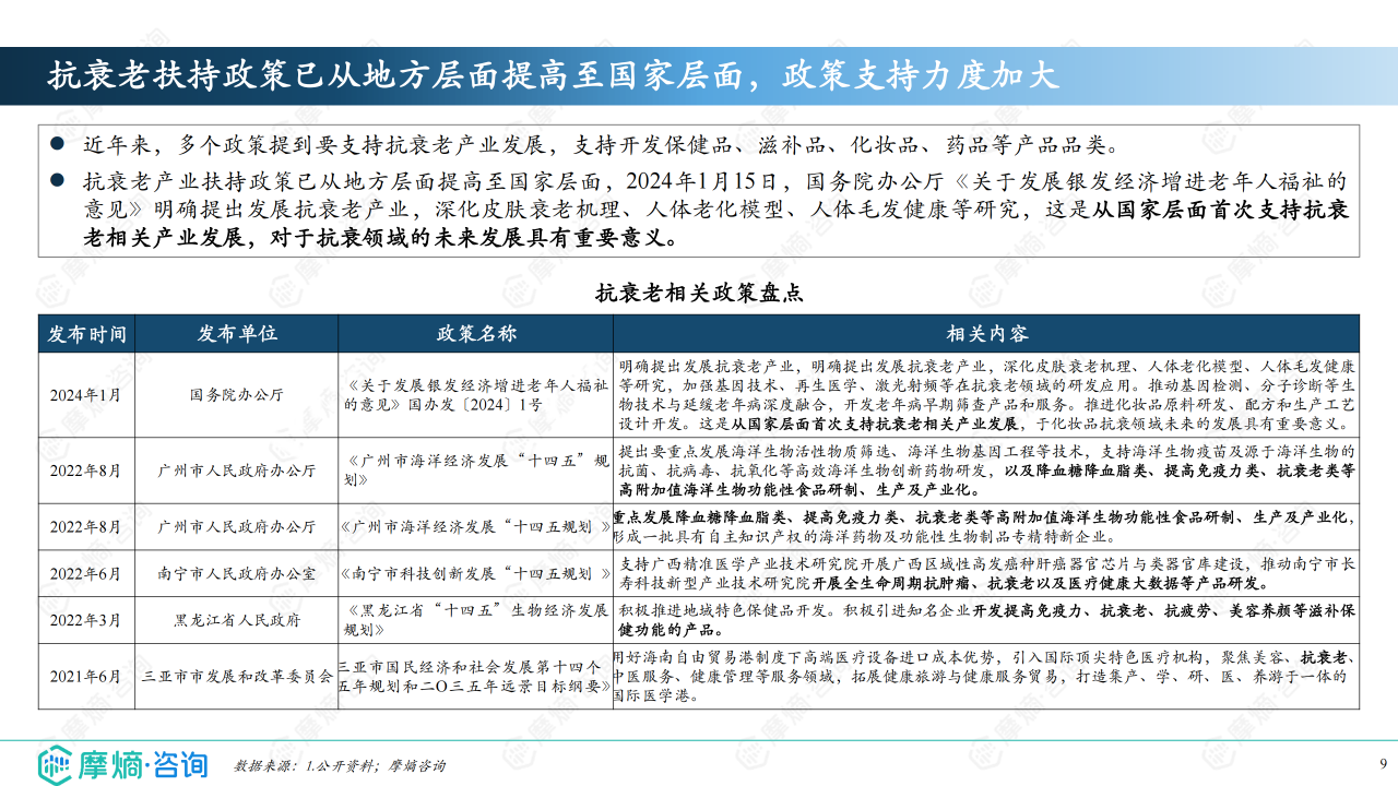 近年来,国家层面出台多项政策支持抗衰老产业发展,这将进一步推动市场规模的增长和产业的规范化发展。