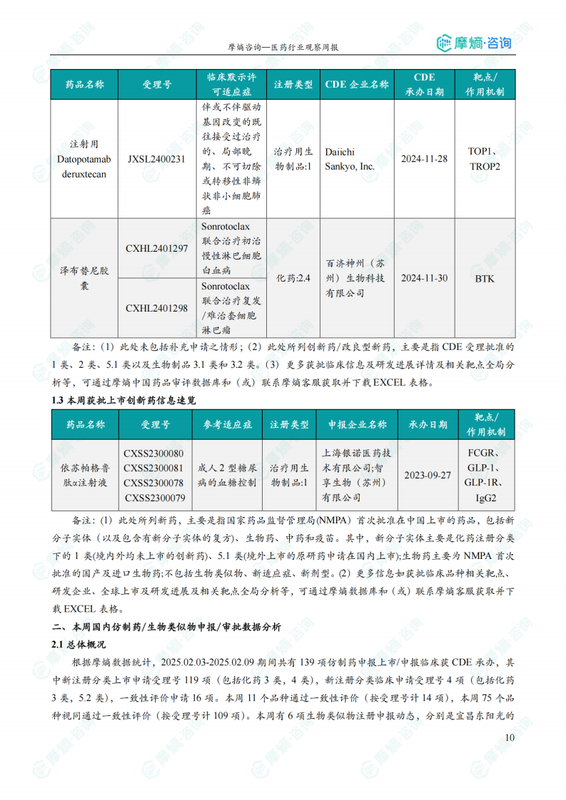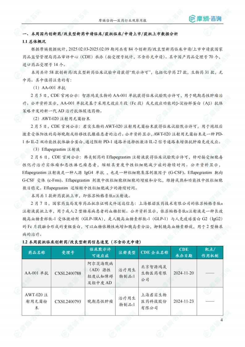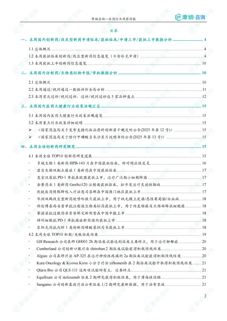 本报告基于摩熵咨询2025年2月3日至2025年2月9日医药行业观察周报数据,对中国及全球医药市场创新药、仿制药及生物类似物研发和审批动态进行统计分析,并对重点政策法规进行解读。核心观点如下: