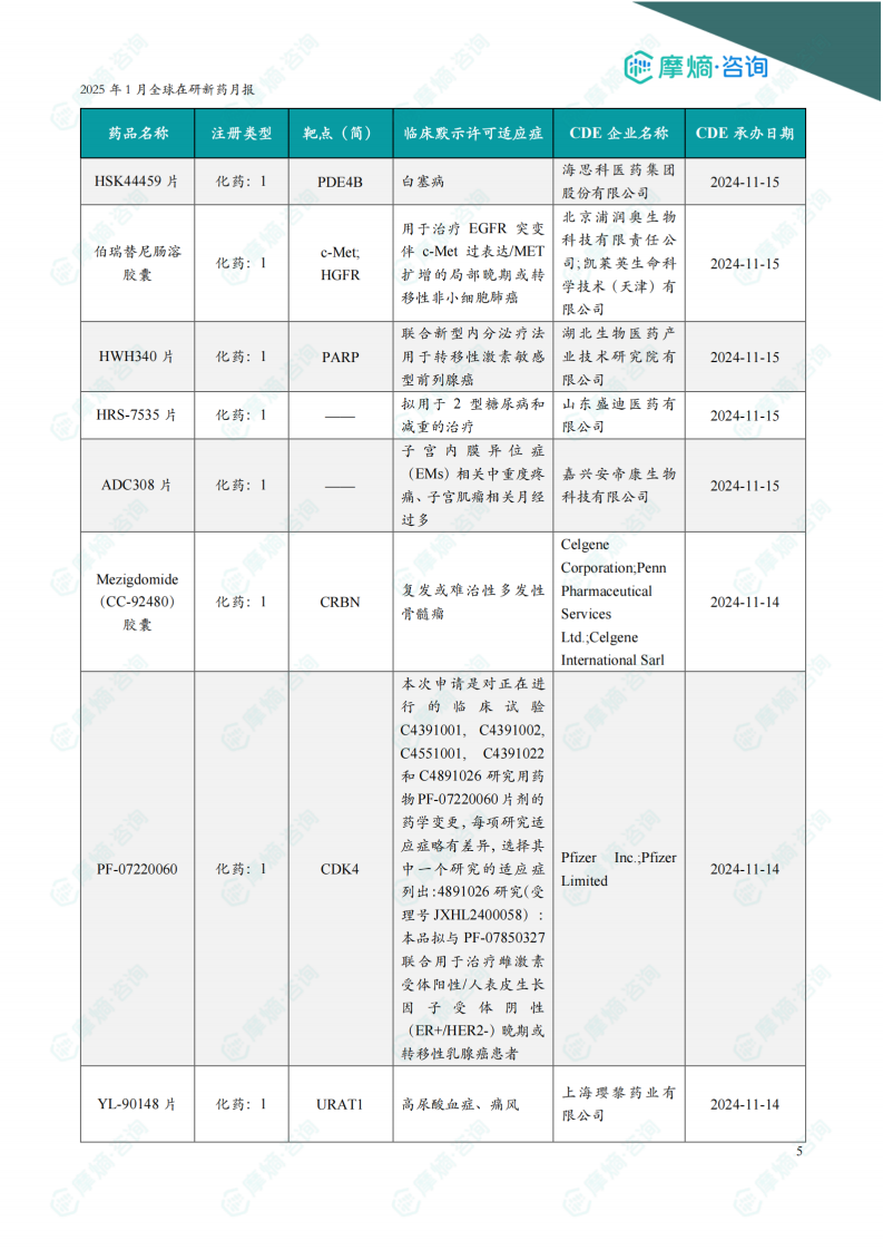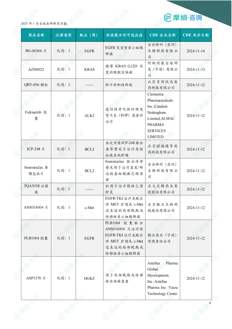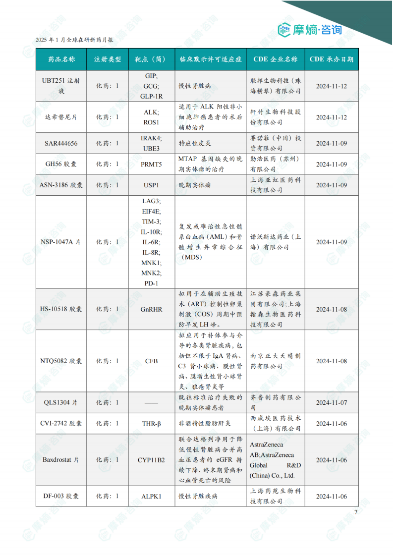 本部分列出了2025年1月全球范围内获得孤儿药、突破性疗法或快速通道资格认定的创新药品种,包括药品名称、靶点、适应症、参与研发的企业以及特殊审批类型和研发阶段等信息。表格清晰地展现了全球创新药研发的竞争格局和发展趋势。