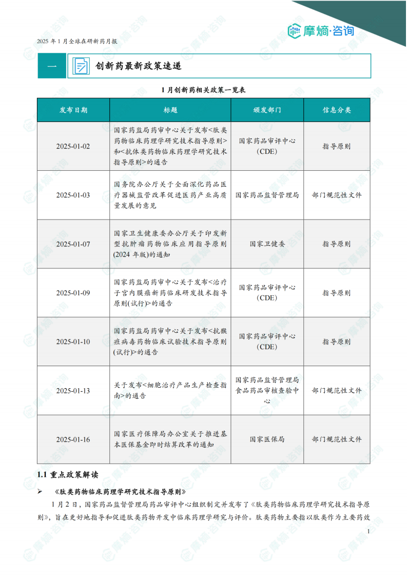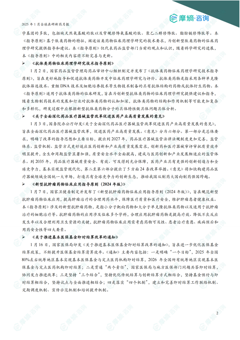 本部分概述了2025年1月发布的与创新药相关的重点政策,包括针对肽类药物、抗体类药物的临床药理学研究技术指导原则,以及关于全面深化药品医疗器械监管改革、新型抗肿瘤药物临床应用指导原则和基本医保基金即时结算改革的意见和通知。这些政策旨在规范创新药研发和临床应用,提高医药产业整体质量和效率。