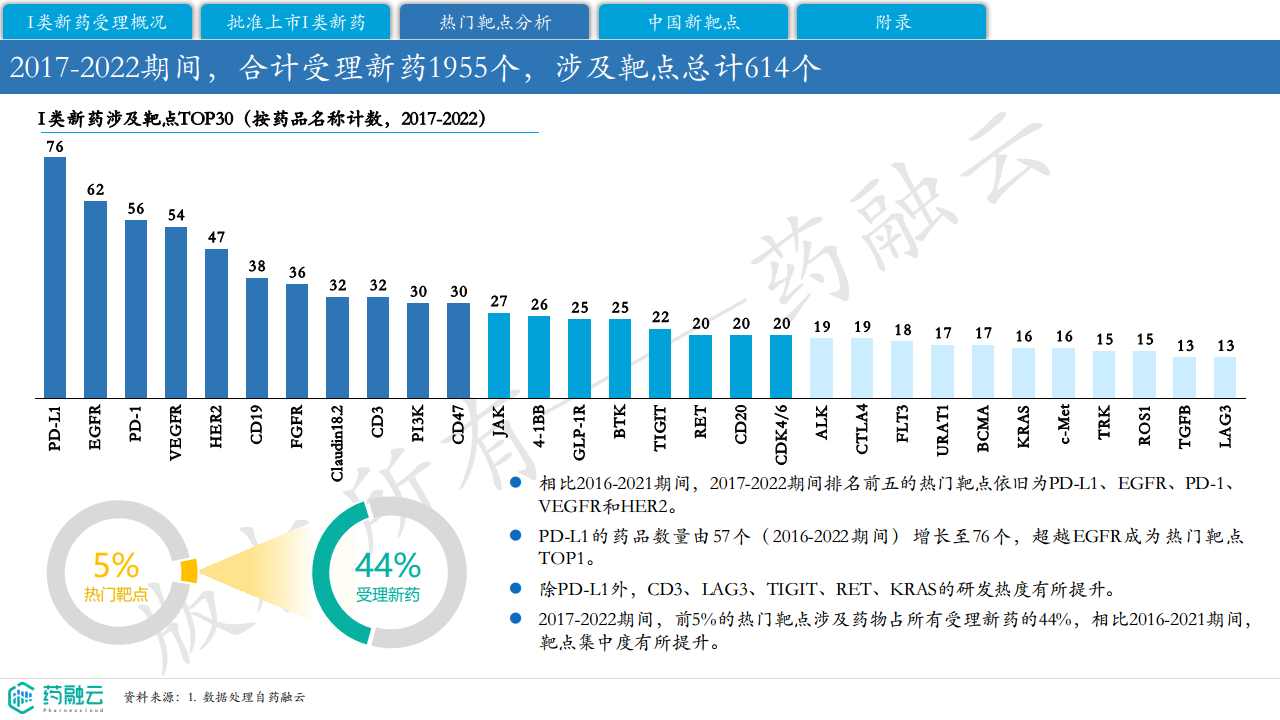 本报告基于摩熵医药数据库截至2022年11月30日的统计数据,对2017-2022年中国I类新药(不含中药和原料药)的受理和批准上市情况进行了分析。报告分为四个主要部分:首先,对2017-2022年CDEⅠ类新药申请受理数量和靶点数量进行了统计;其次,进行了分类统计,包括Ⅰ类新药品种分类统计、靶点对应新药数量统计、治疗领域对应新药靶点分类统计,以及热门靶点随时间的变迁分析;第三部分列出了部分2022年热门靶点的新药研发阶段;最后,报告探索了2023年潜在的“中国新”靶点,为未来的药物研发提供了方向。