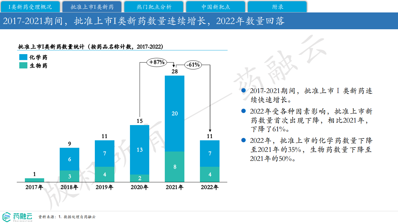 2017-2021年,批准上市I类新药数量连续快速增长。然而,2022年受各种因素影响,批准上市新药数量首次出现下降,相比2021年下降了61%。2022年,批准上市的化学药数量下降至2021年的35%,生物药数量下降至2021年的50%。
